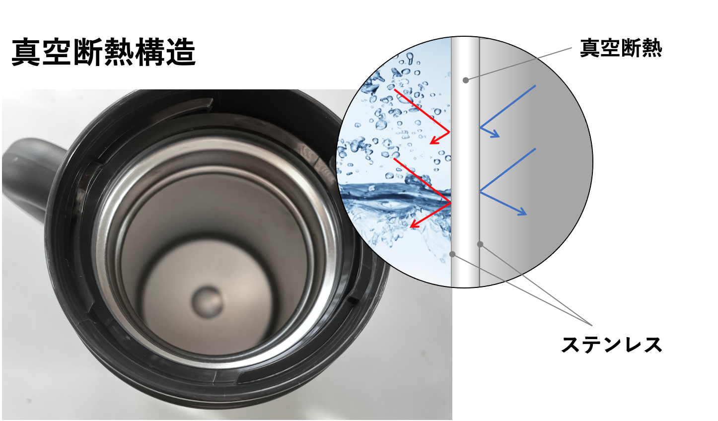 HANDLE TUMBLERは保温、保冷力の高いステンレスの二重真空断熱構造。外びんと内びんの間を真空状態にすることで、対流による放熱を防ぎます。