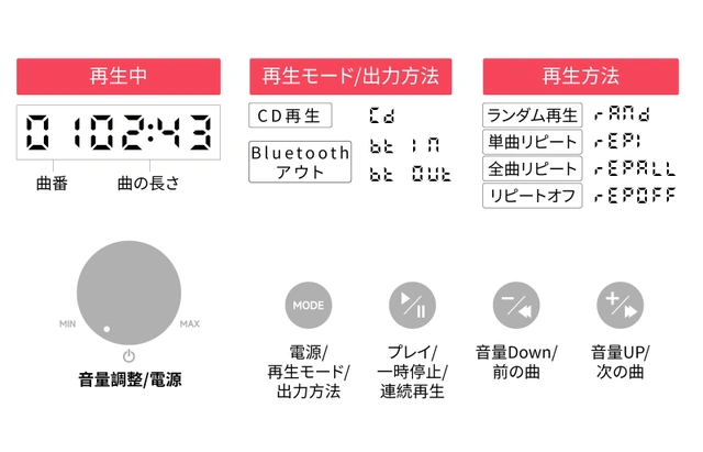 組み込みディスプレイでは、曲番、曲の長さ、ランダム再生かリピート再生等の情報を確認できます。