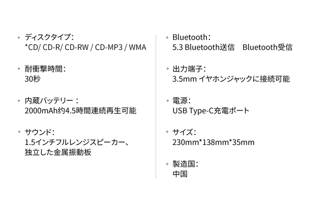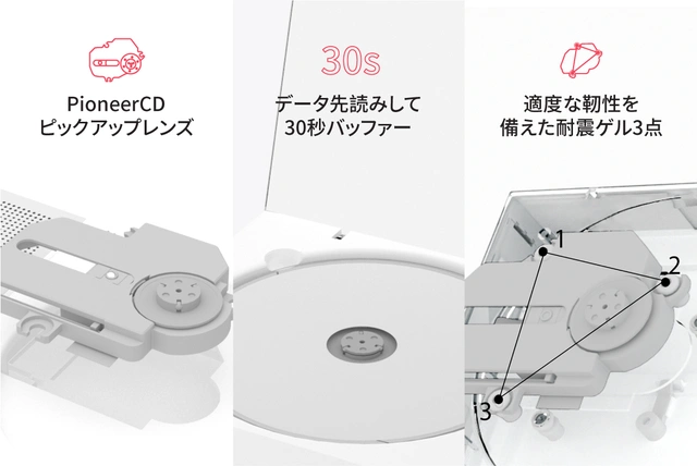 SPLITはPioneer製CDピックアップレンズを採用し、高精度なデータ読み取りと優れたエラー訂正を実現。さらに30秒先読みバッファーにより動作中も音飛びなくスムーズに再生でき、耐震ゲル3点設計のドライブ構造で強度と安定性も確保しています。