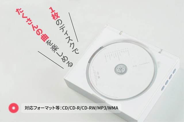 再生ディスクは、CD、CD-R及びCD-RWと幅広く可能、MP3等圧縮フォーマットにも対応し、聴ける音楽の幅が広がります。