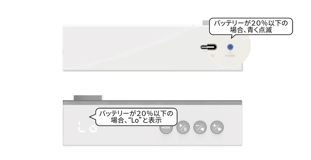 A9: バッテリーが20%以下になると、Powerランプが青く点滅し、ディスプレイにも”Lo”と表示されます。