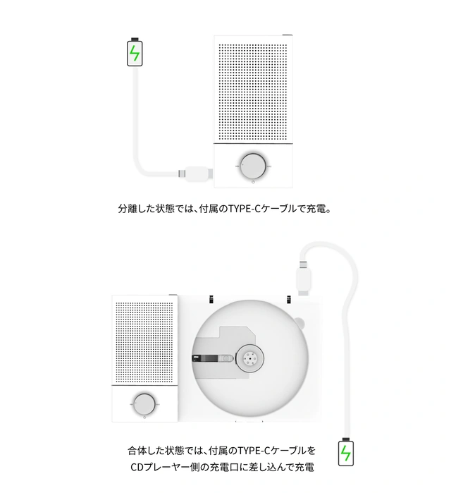 A6:SPLITのBluetoothスピーカーにはリチウム電池が内蔵されており、付属のTYPE-Cケーブルで充電します。スピーカーとCDプレーヤーが分離した状態ではスピーカーへ、合体した状態ではCDプレーヤー側の充電口へ差し込んで充電してください。