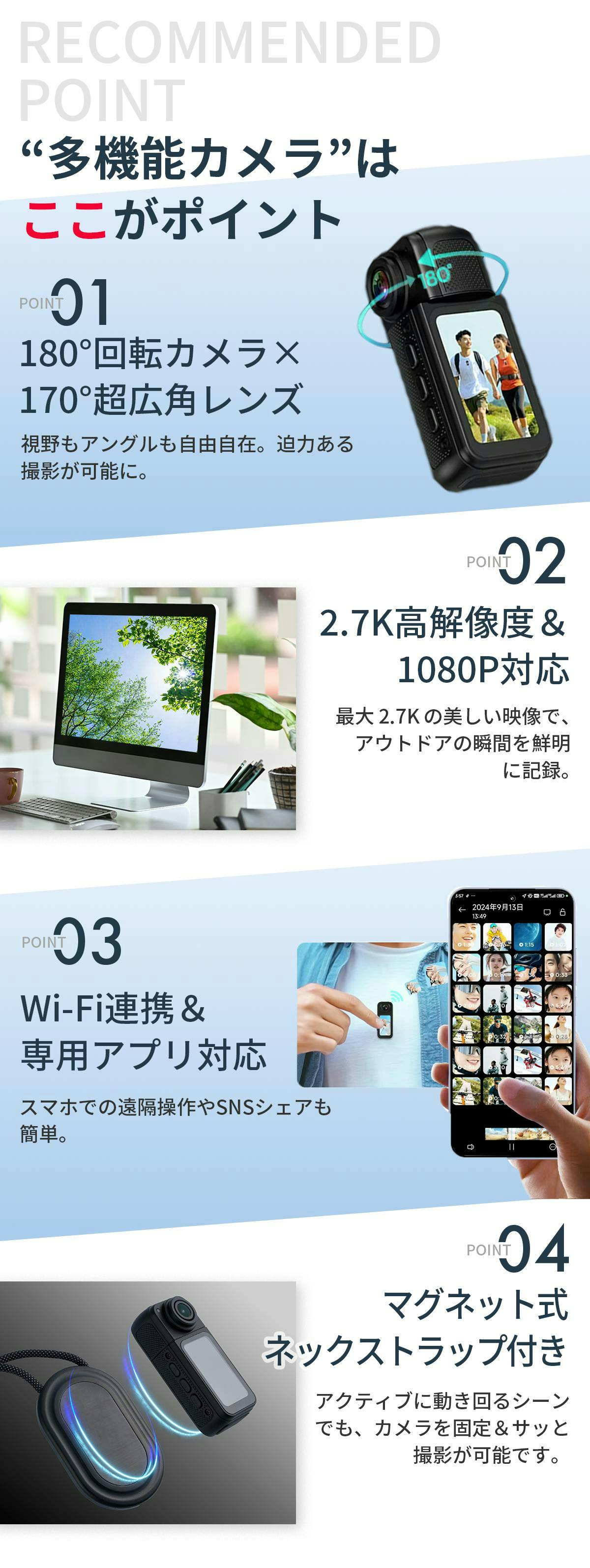 このプロジェクトでは、2.7K高解像度と180°回転×170°広角レンズを備えたアクションカメラを紹介します。アウトドアや旅行での臨場感あふれる映像撮影を可能にし、内蔵Wi-Fiでスマホから簡単操作も実現。