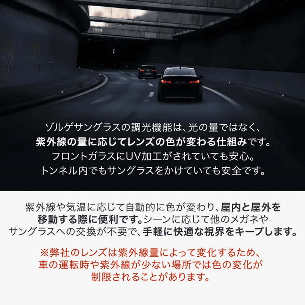 ゾルゲサングラスは、「調光・偏光・UVカット」全てを1つのレンズで実現!