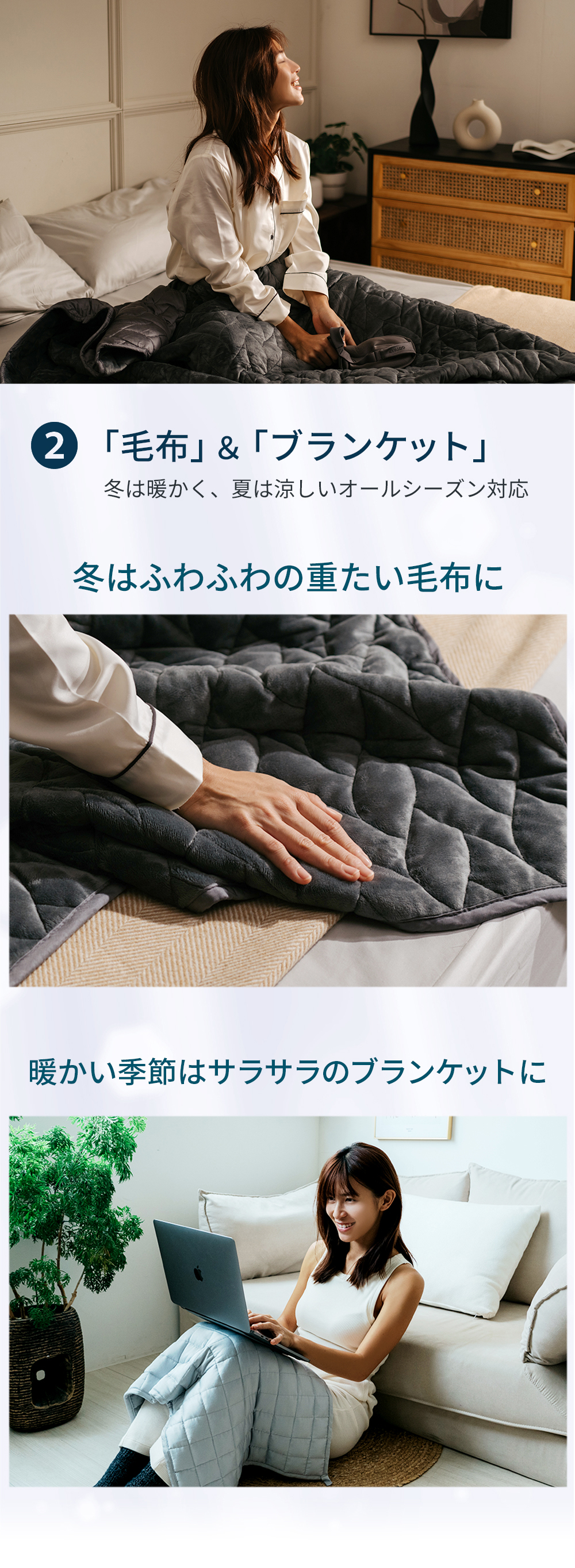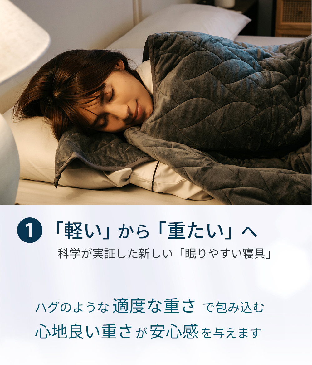 掛け布団は「軽い」から「重たい」へ。抱きしめられるような安心感と抜群の手触りで睡眠環境をサポート! 重力ブランケット型掛け布団。