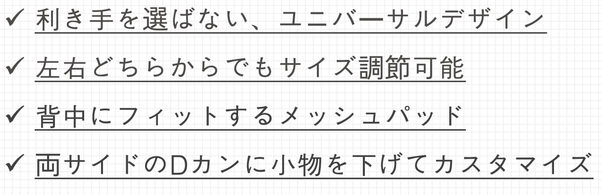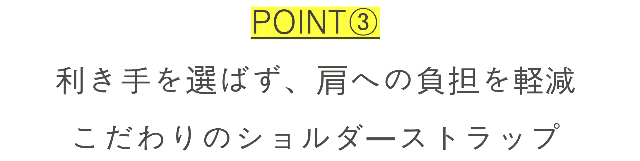 バッグの使い勝手を大きく左右するのが、ショルダーストラップ。どちらの肩にも掛けられるユニバーサルデザインで、利き手を選ばず、左右どちらからでもストラップの長さ調整ができるよう仕上げました。