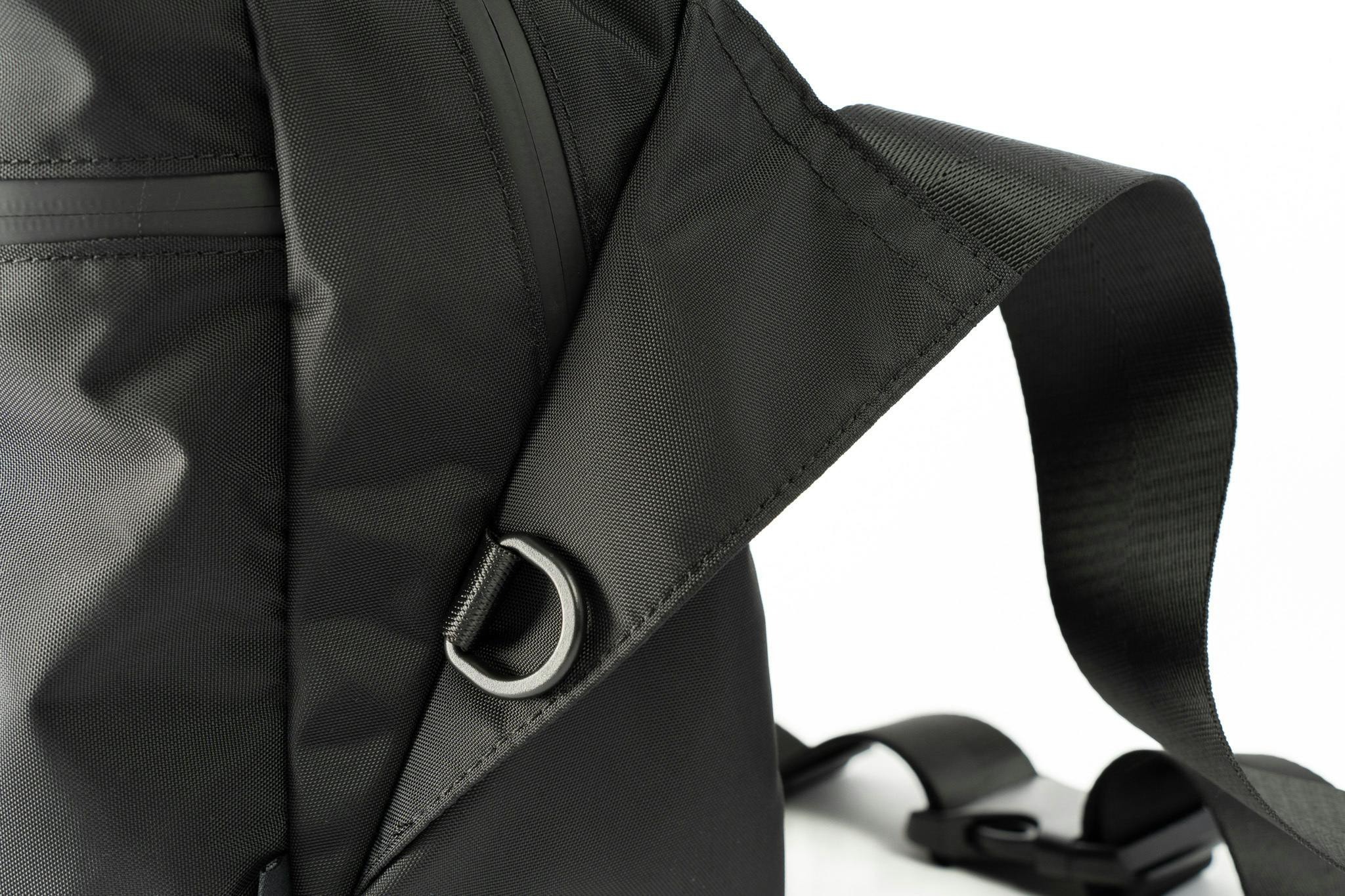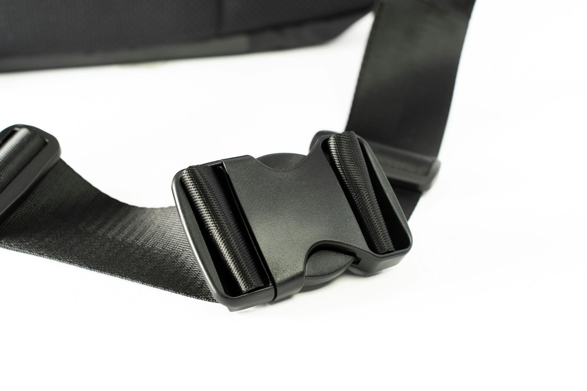 ストラップは5cmと幅広にし、荷物量が多くても肩への負担を軽減します。それに合わせて、バックルも大きく厚みのある質実剛健なパーツを採用。ノートPCやカメラほか、重い荷物を入れても耐えられるようにするには欠かせない要素です。