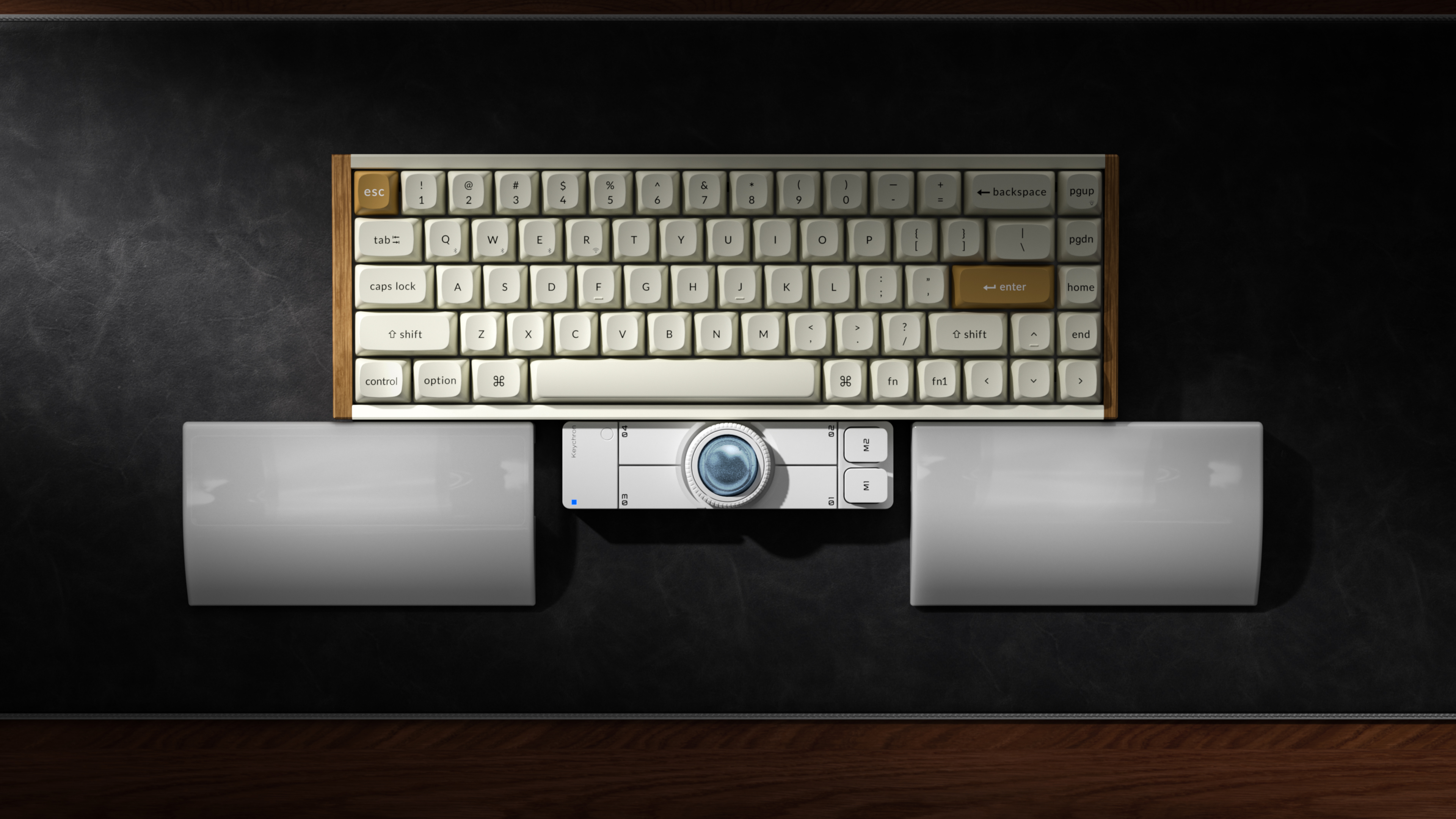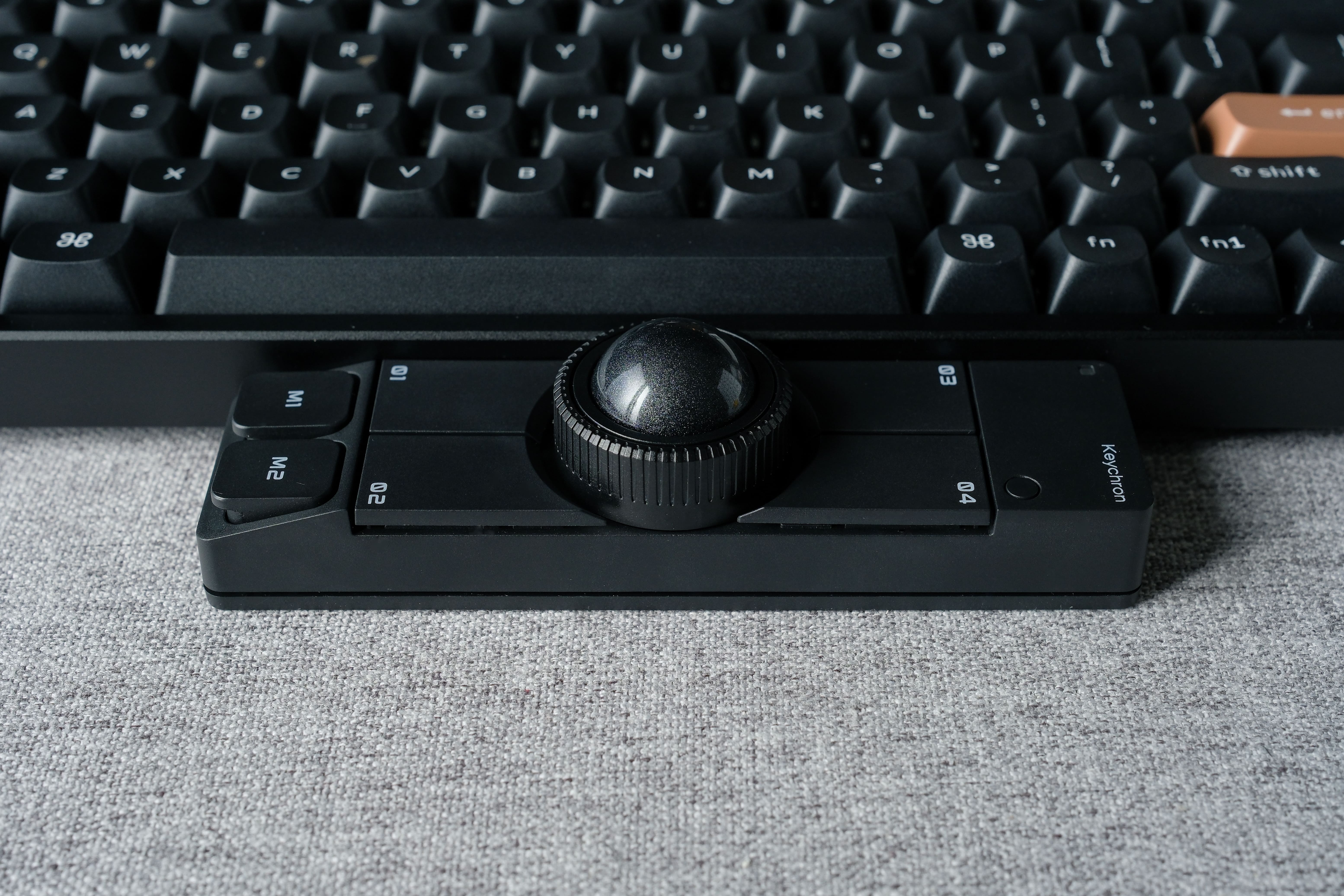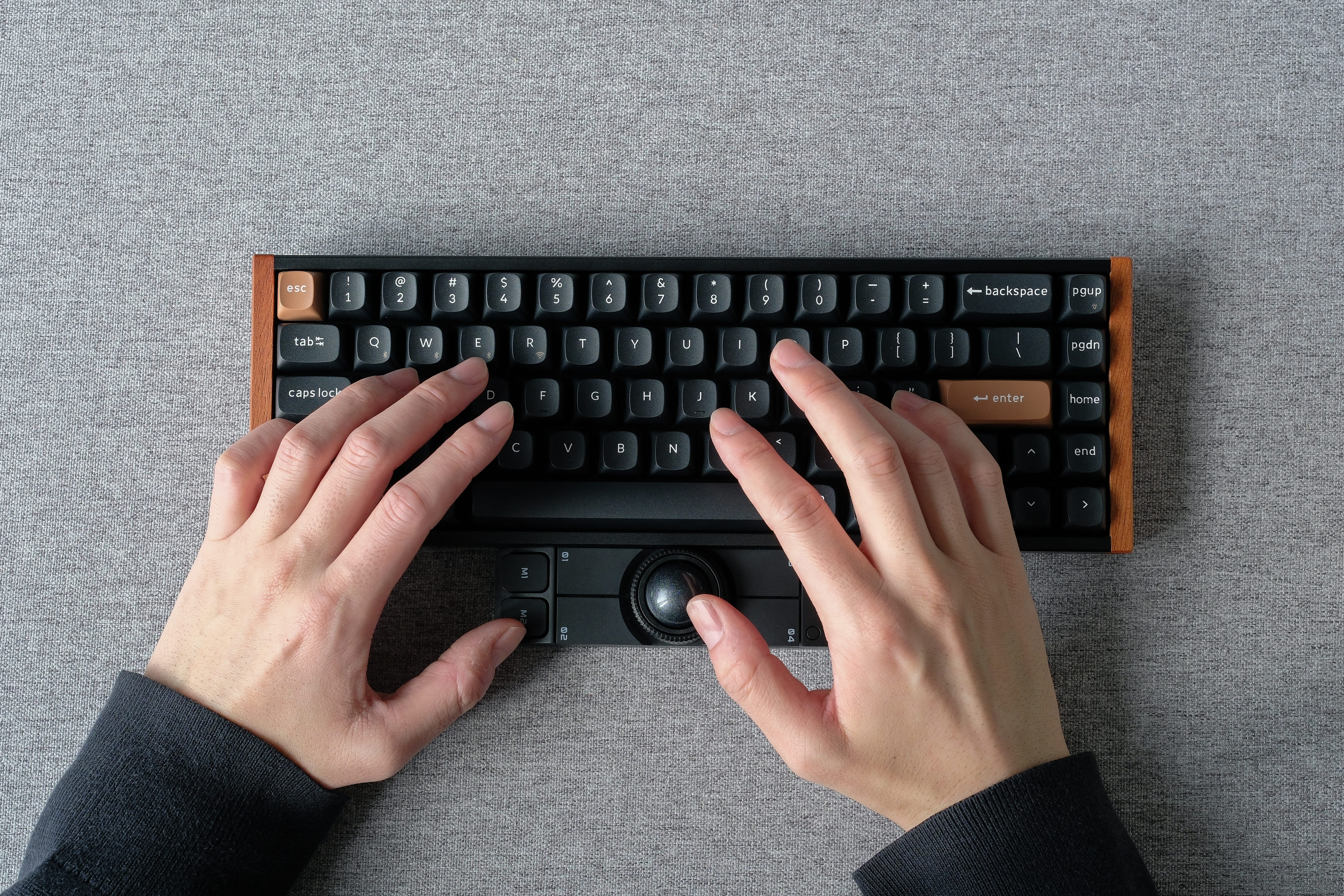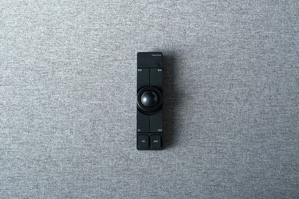 キーボードのお供に。メカニカルキーボードの下に置いて左右の親指で操作。OctaShiftによってボール操作は左手でも右手でも対応できます。