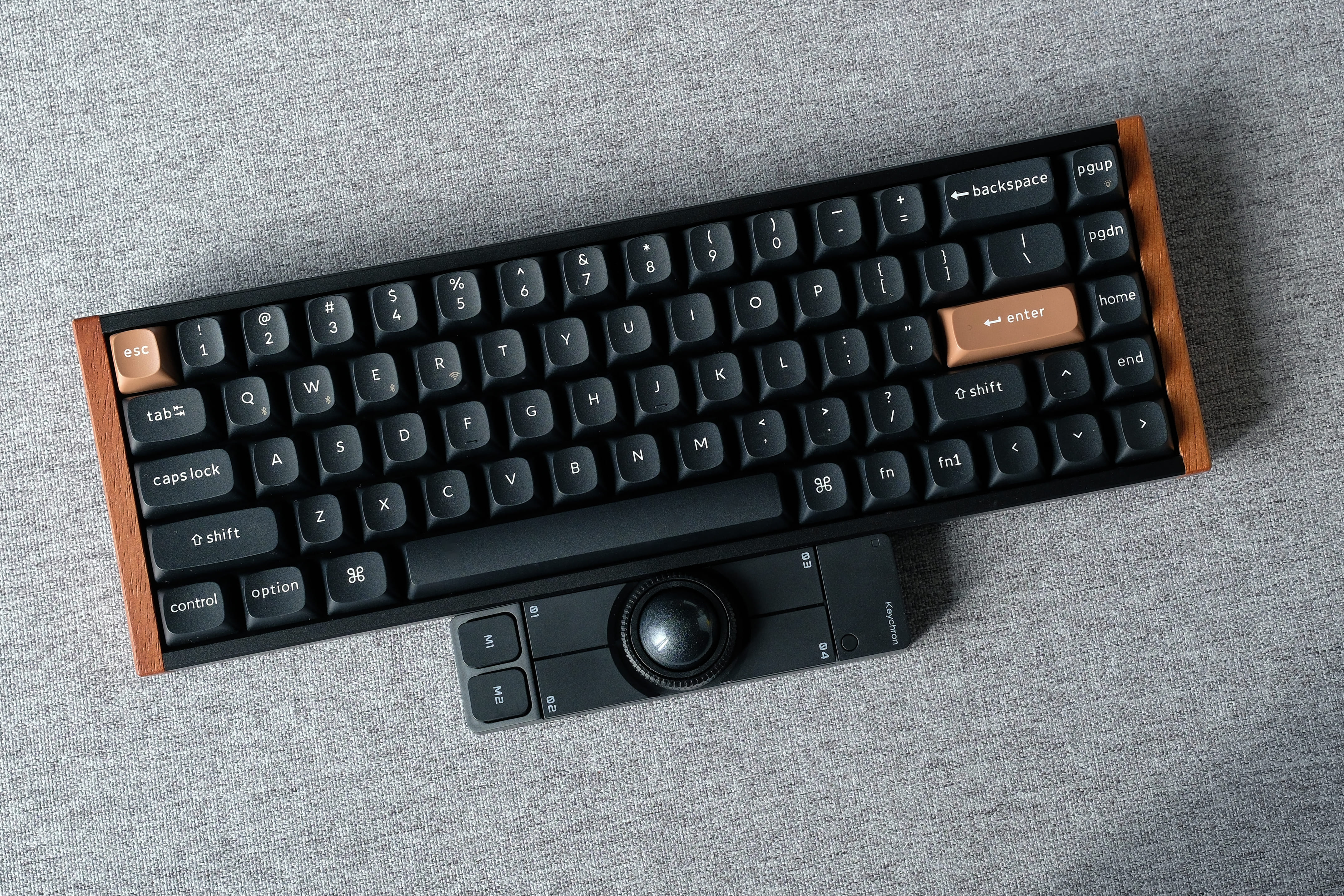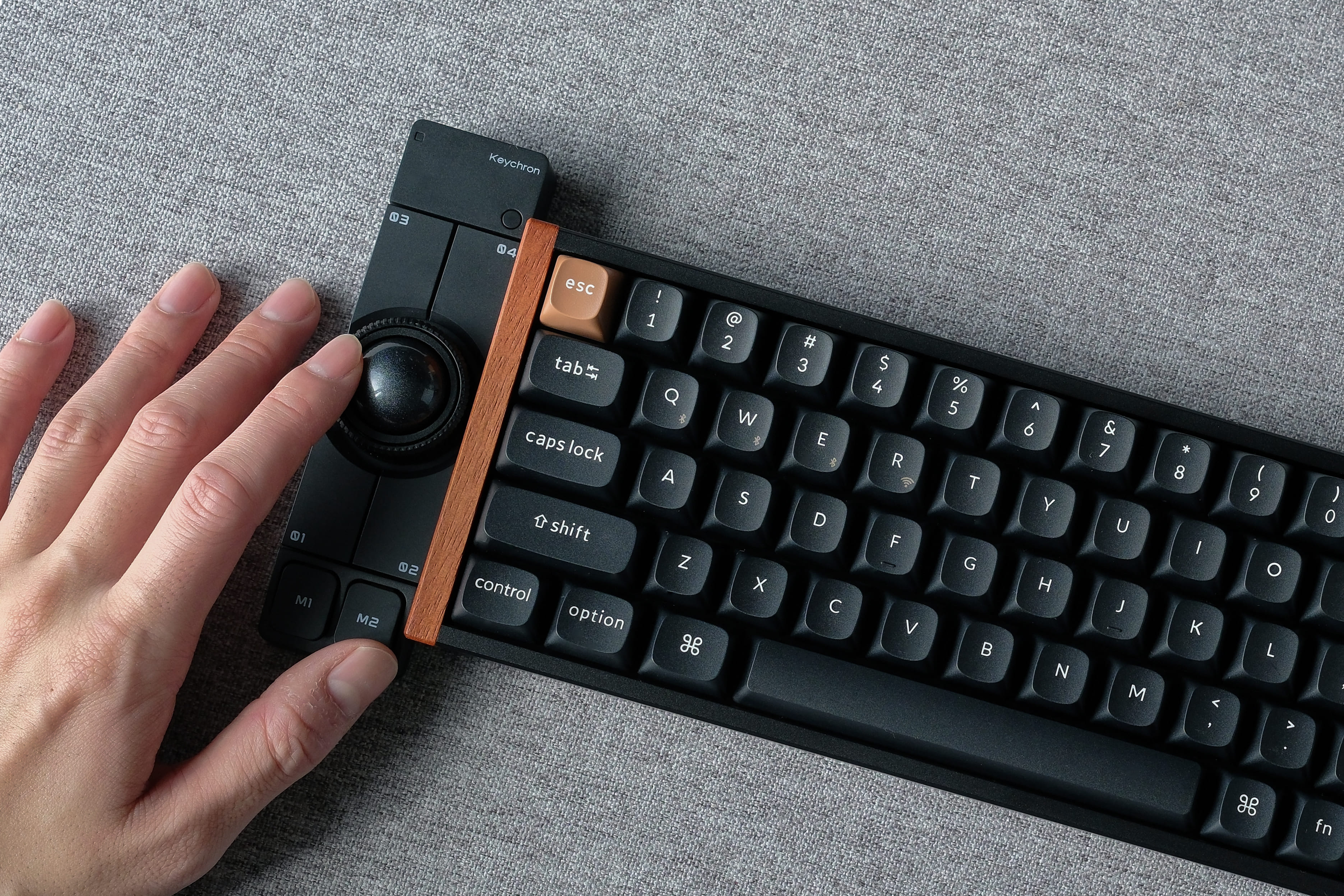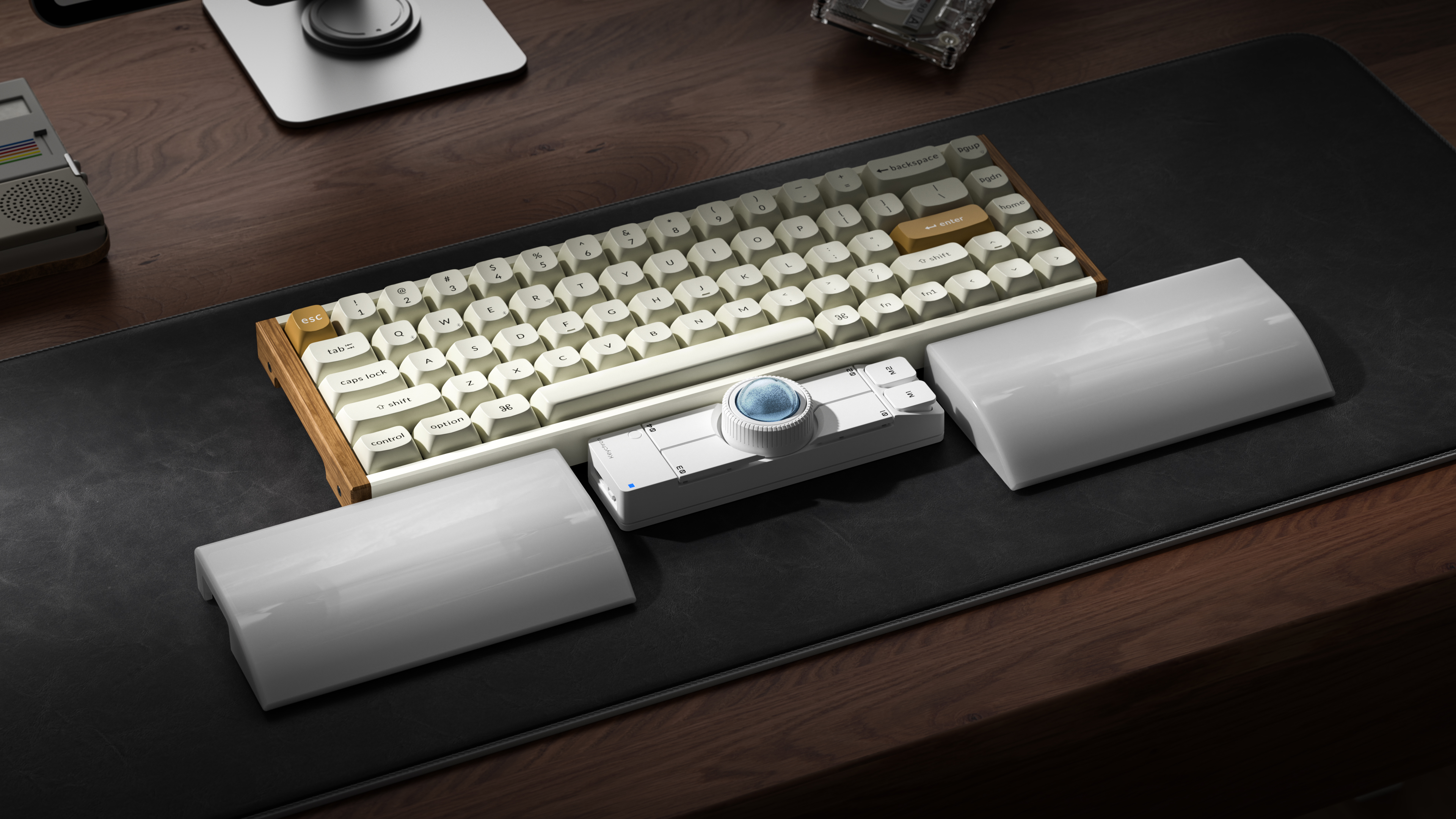 キーボードのお供に。メカニカルキーボードの下に置いて左右の親指で操作。OctaShiftによってボール操作は左手でも右手でも対応できます。