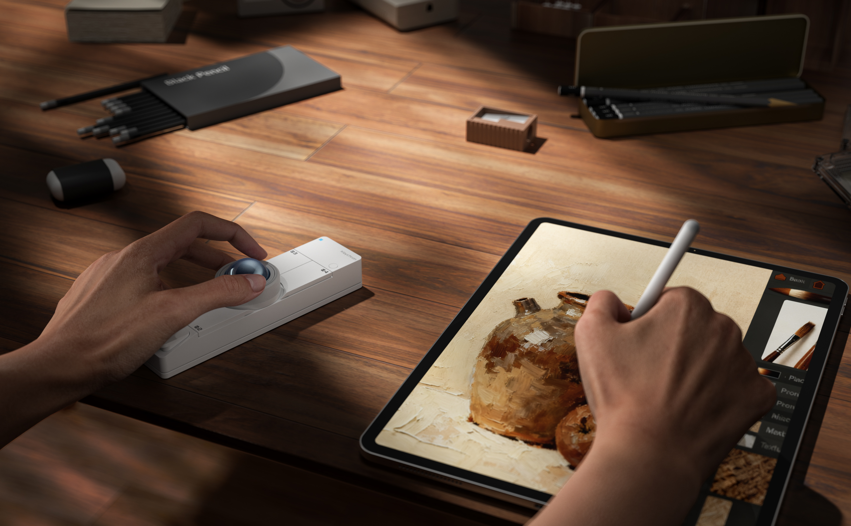 マクロパッドとして。iPadやペンタブレットの横に置いてマクロパッドとしても活躍します。 キーボードショートカットを割り当てることで、作業スペースはすっきりとさせたまま効率よく制作できます。