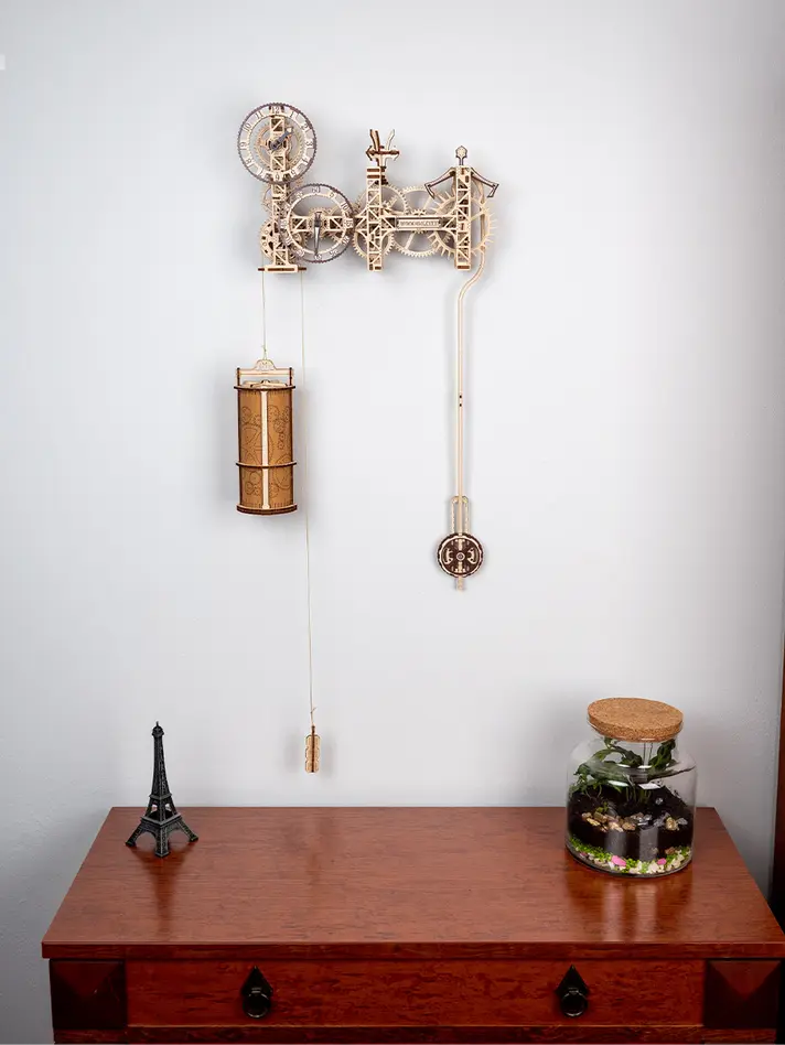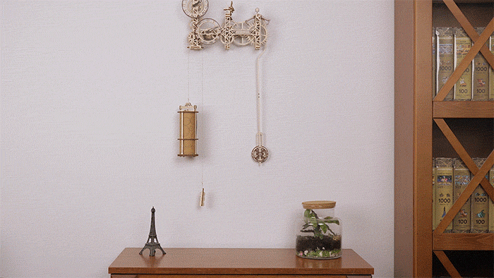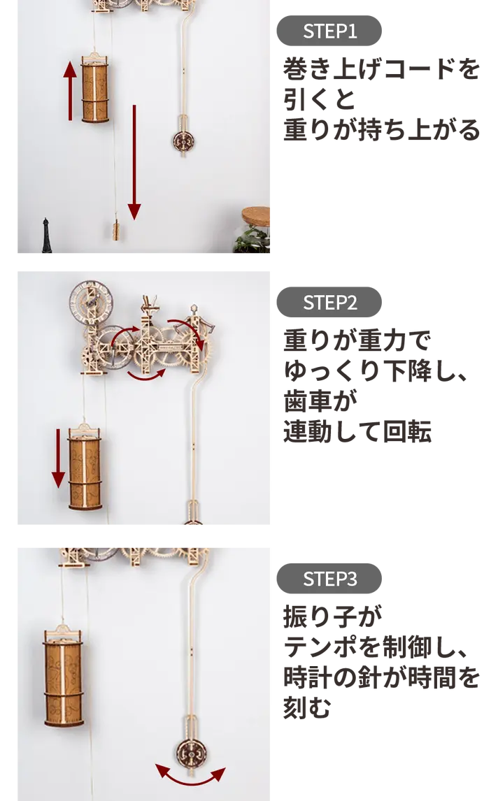 この時計は電池を使わず、重りの重力と精密な歯車によって動作します。