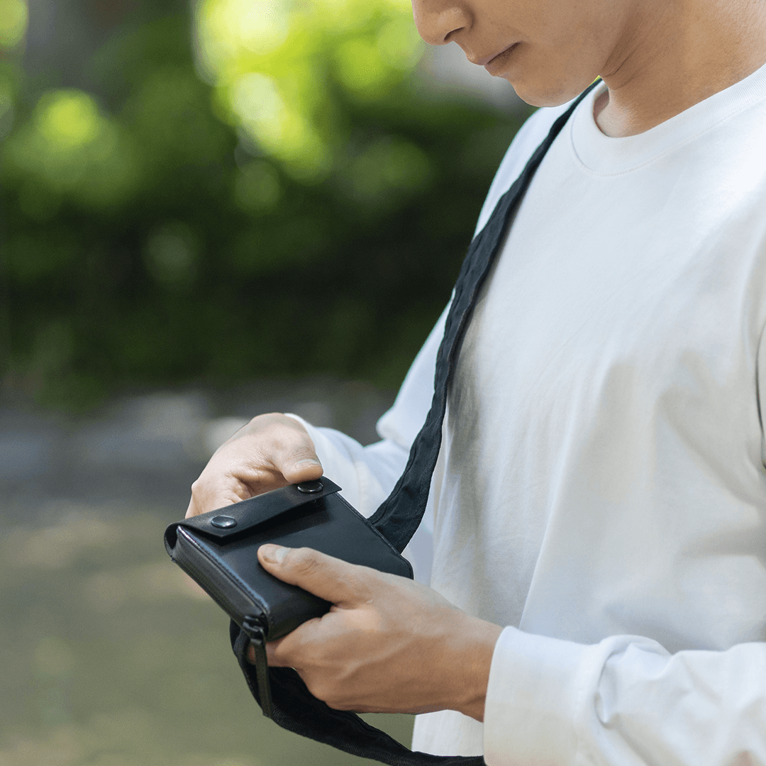 財布をズボンのポケットに入れていると気になる不格好な膨らみ、窮屈さ、落下や盗難の心配を解消すべく、ベルトやショルダーストラップに付けて使用できる財布を開発しました。