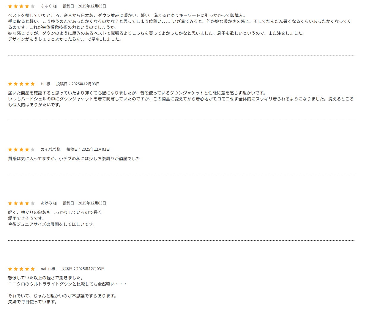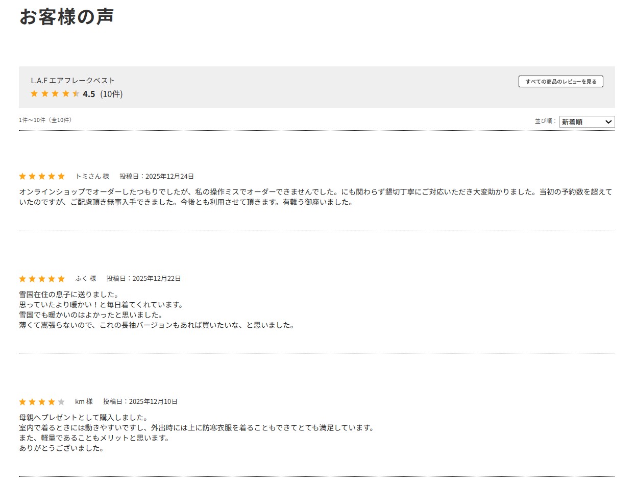 【L.A.F 帝人ミノテック・エアーフレイクベスト】羽毛のように軽くて、暖かい。そして洗える。生体模倣技術から生まれたベスト誕生!