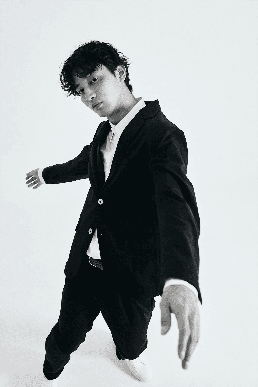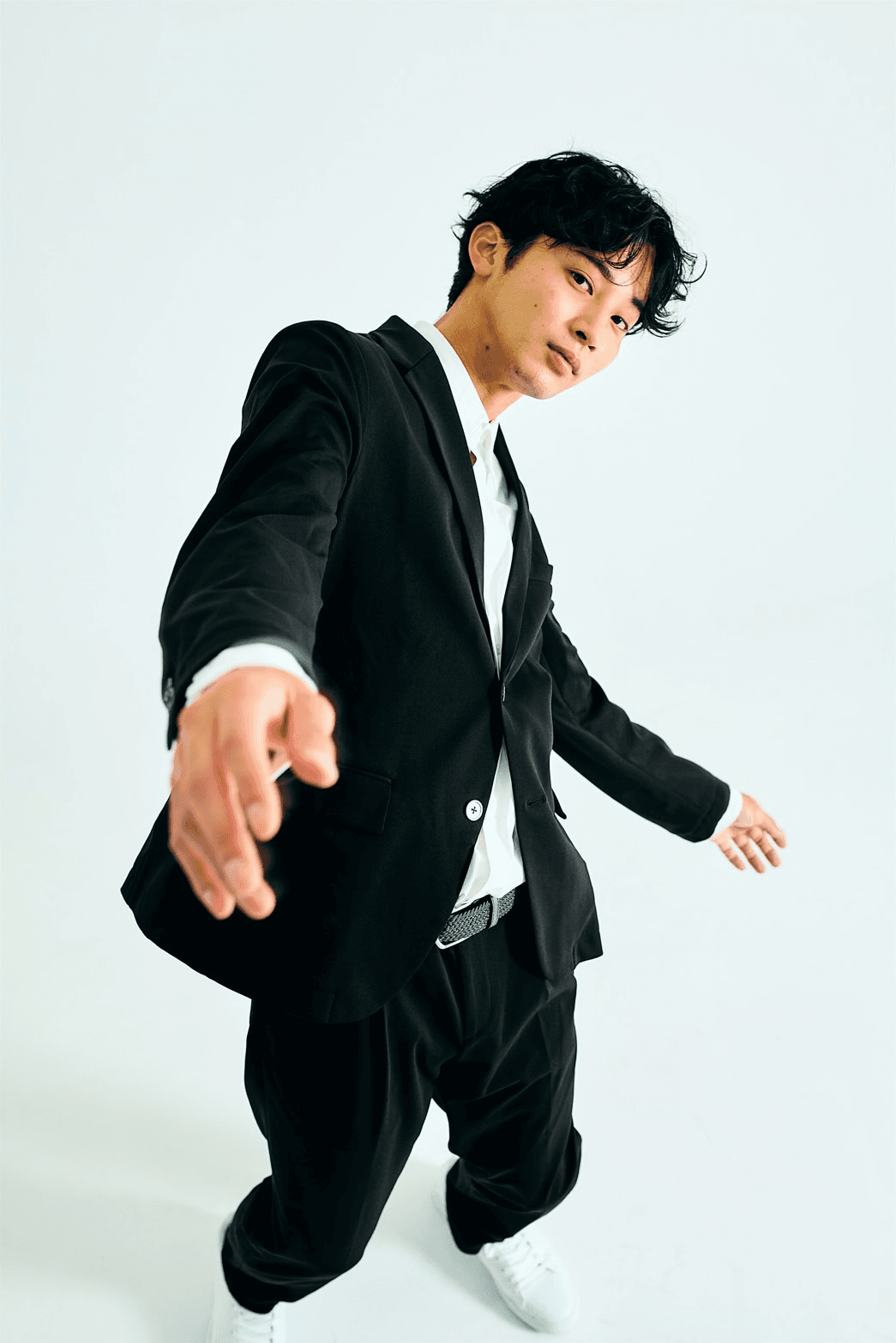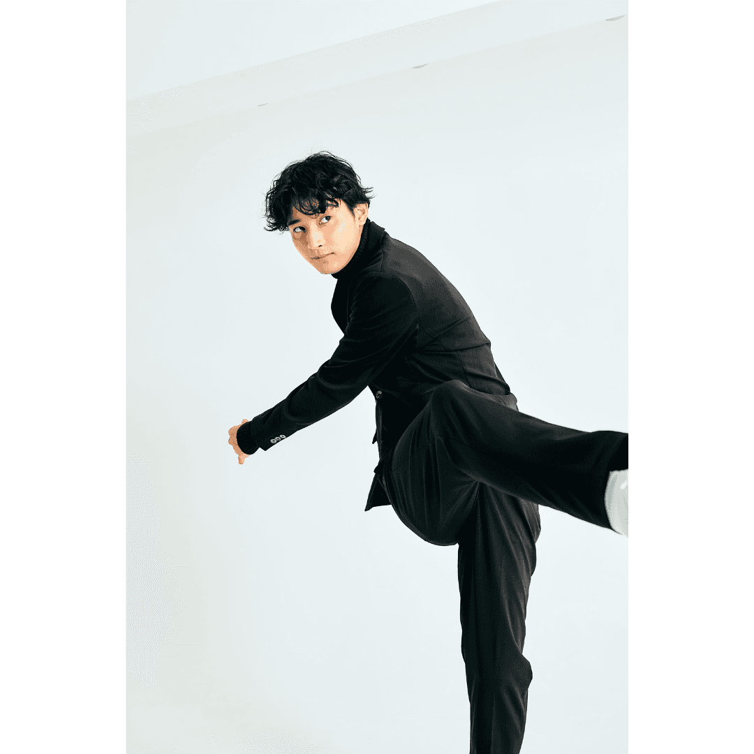 ストレッチが効いているのでスーツを着たまま、異次元の動きも。走ったり、飛んだり、手を伸ばしたりストレスフリーで可能です。
