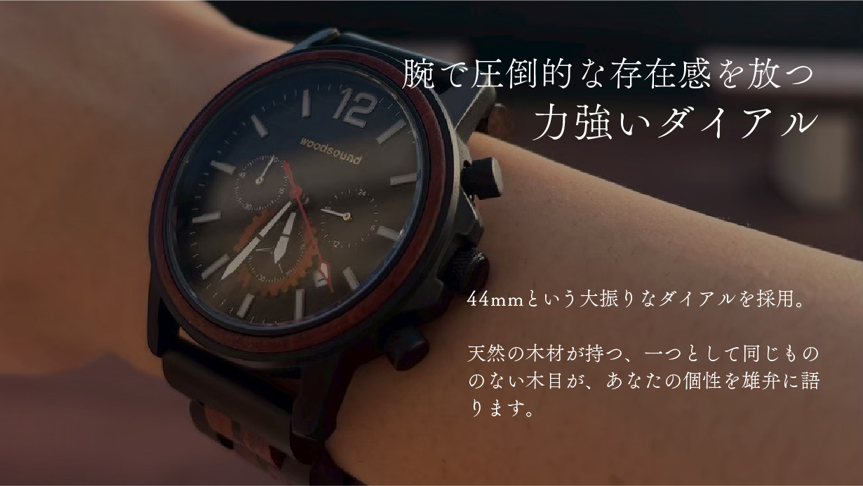 44mmという大振りなダイアルを採用。天然の木材が持つ、一つとして同じもののない木目が、あなたの個性を雄弁に語ります。見る角度によって表情を変えるその様は、まさに"生きた芸術"です。