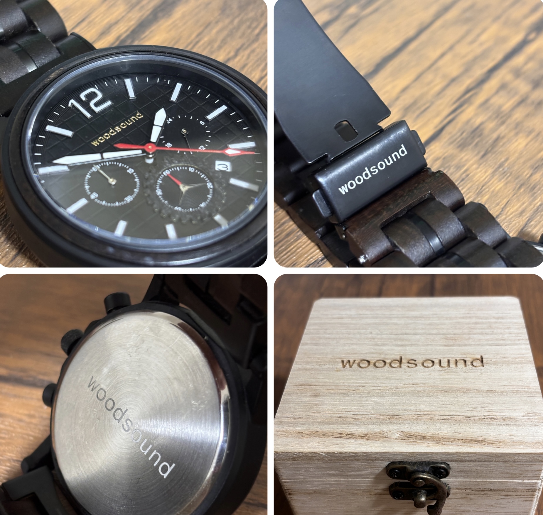 腕時計の文字盤、裏面、バックル、木箱の蓋に「woodsound」のロゴが入っています。文字盤のロゴはゴールドで高級感があります。