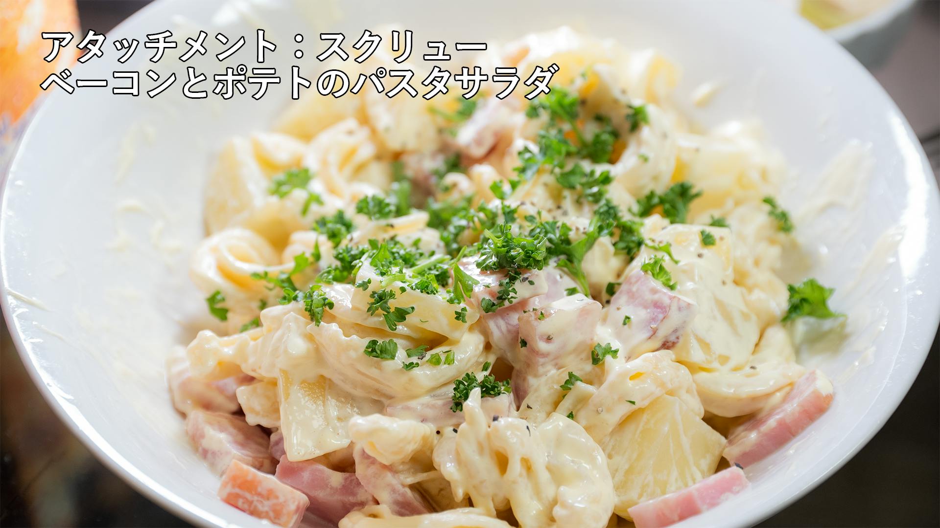 付属品:本体、アタッチメント8種類、小麦計量カップ(すりきり160g)、水計量カップ、プラスチックへら、マニュアル