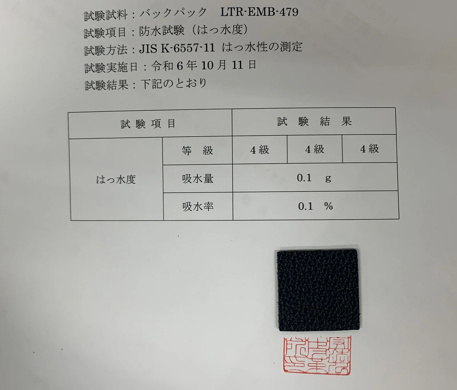 muonで使用しているレザーは、JIS K 6557-11の撥水試験において、等級「4級」を取得しています。