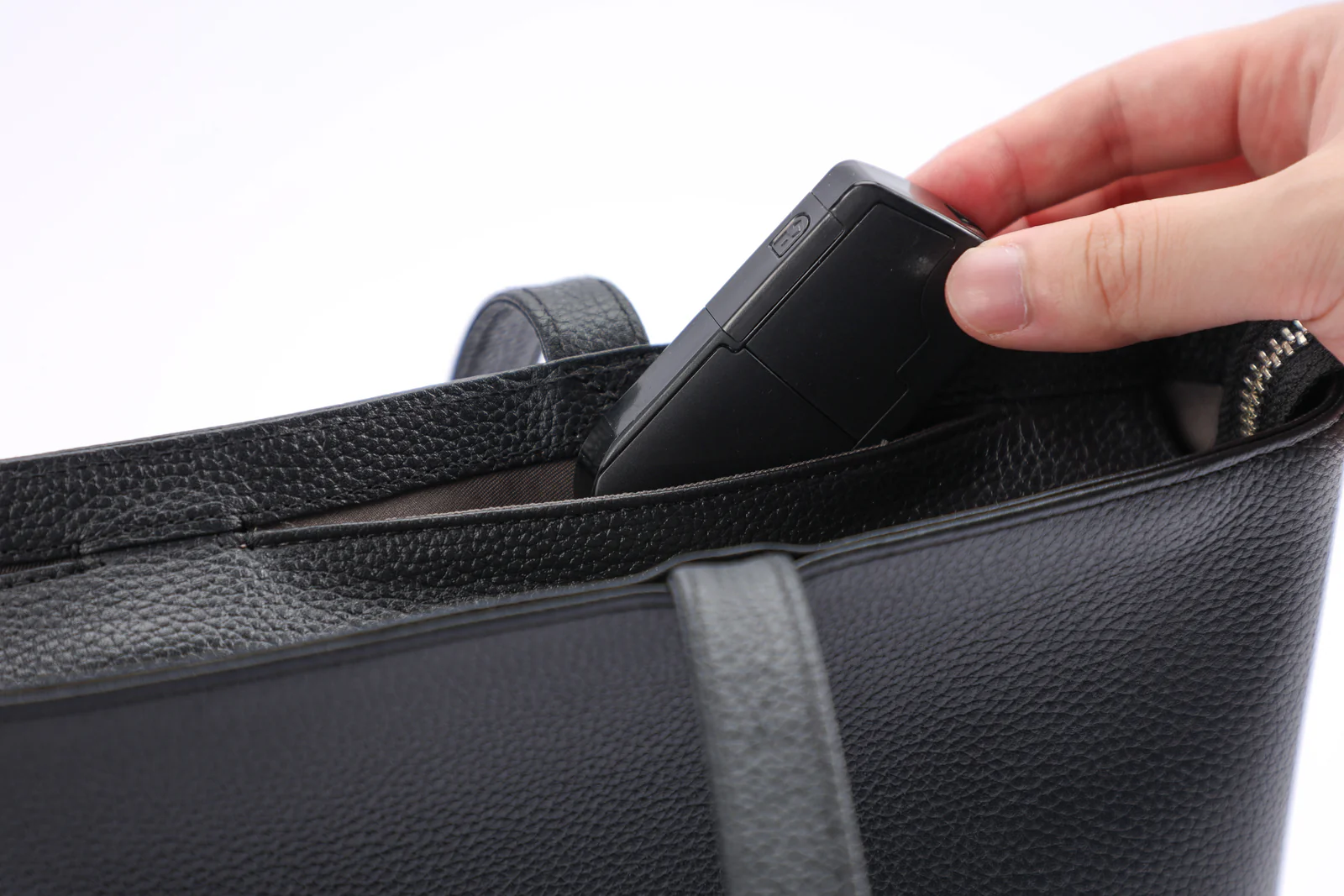 外側には左右で深さの異なるポケットを設置。スマートフォンは左に、イヤホンや鍵、小さめの財布は右に。取り出しやすさに配慮しました。