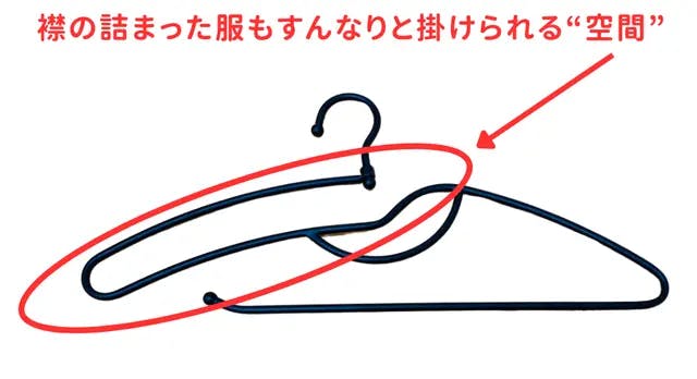 この空間があるから、トレーナーやTシャツなど襟の詰まった衣類でも首元を伸ばさずに掛けれます!