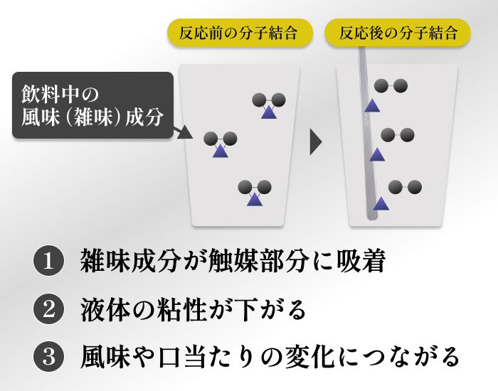 金属触媒加工された表面が液体と触れ合うことで、液体中の水素や酸素に反応し、飲料中に含まれる不純物が触媒表面に吸着されます。
