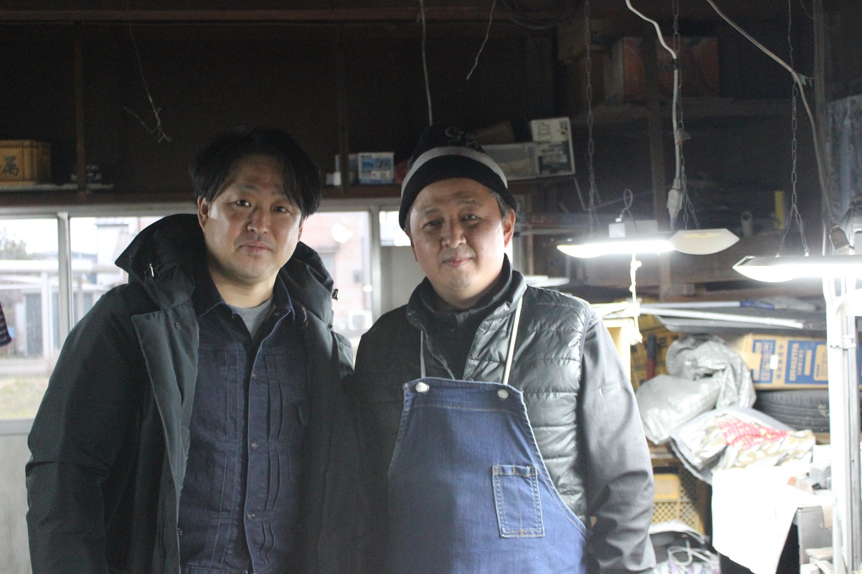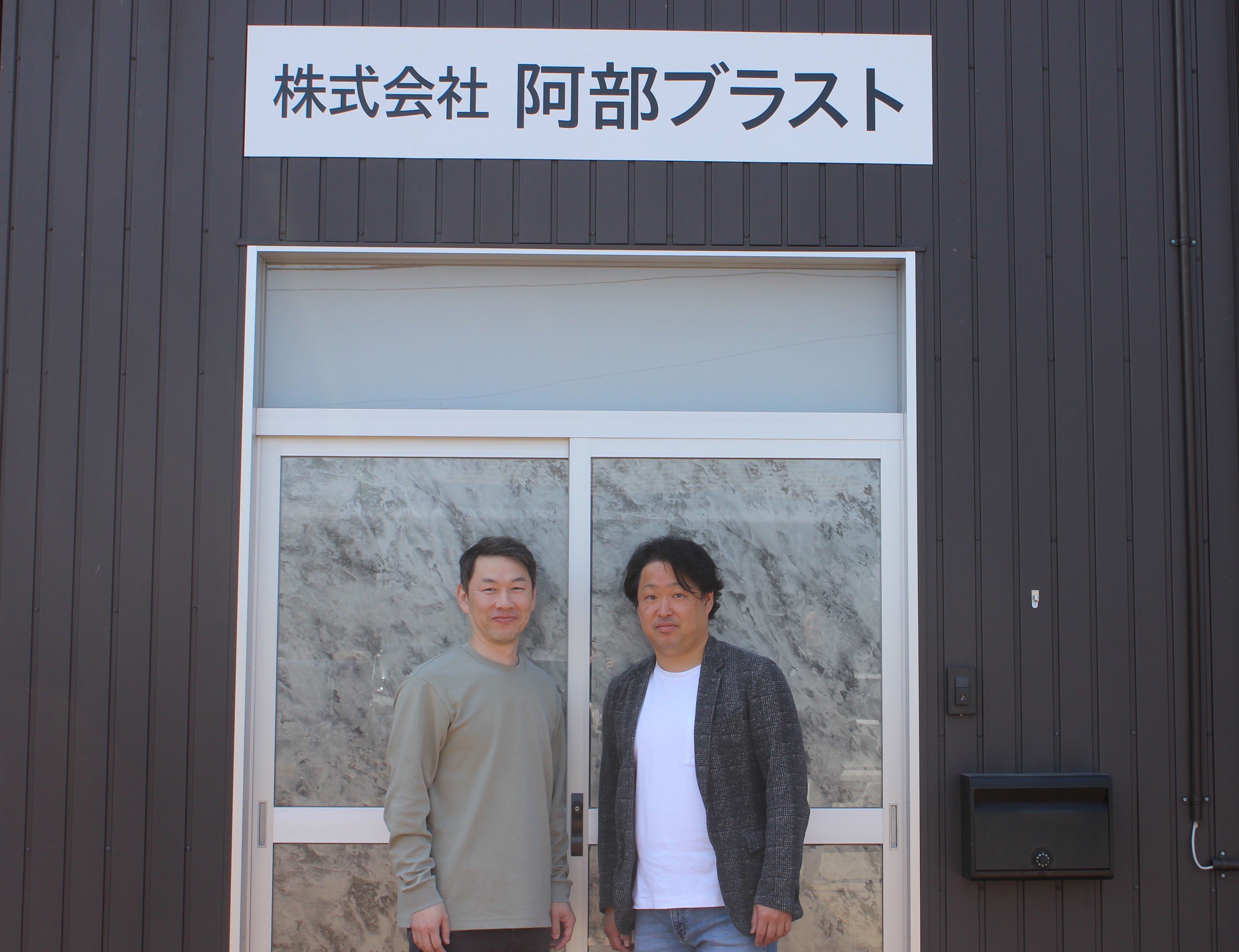 ブラスト仕上げ写真左:株式会社阿部ブラストの阿部様/写真右:弊社代表取締役 井之口