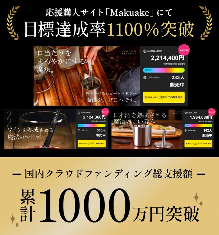 応援購入サイト「Makuake」で公開からわずか1時間で目標達成、最終的には達成率1000%超えを記録した「魔法のマドラー」。