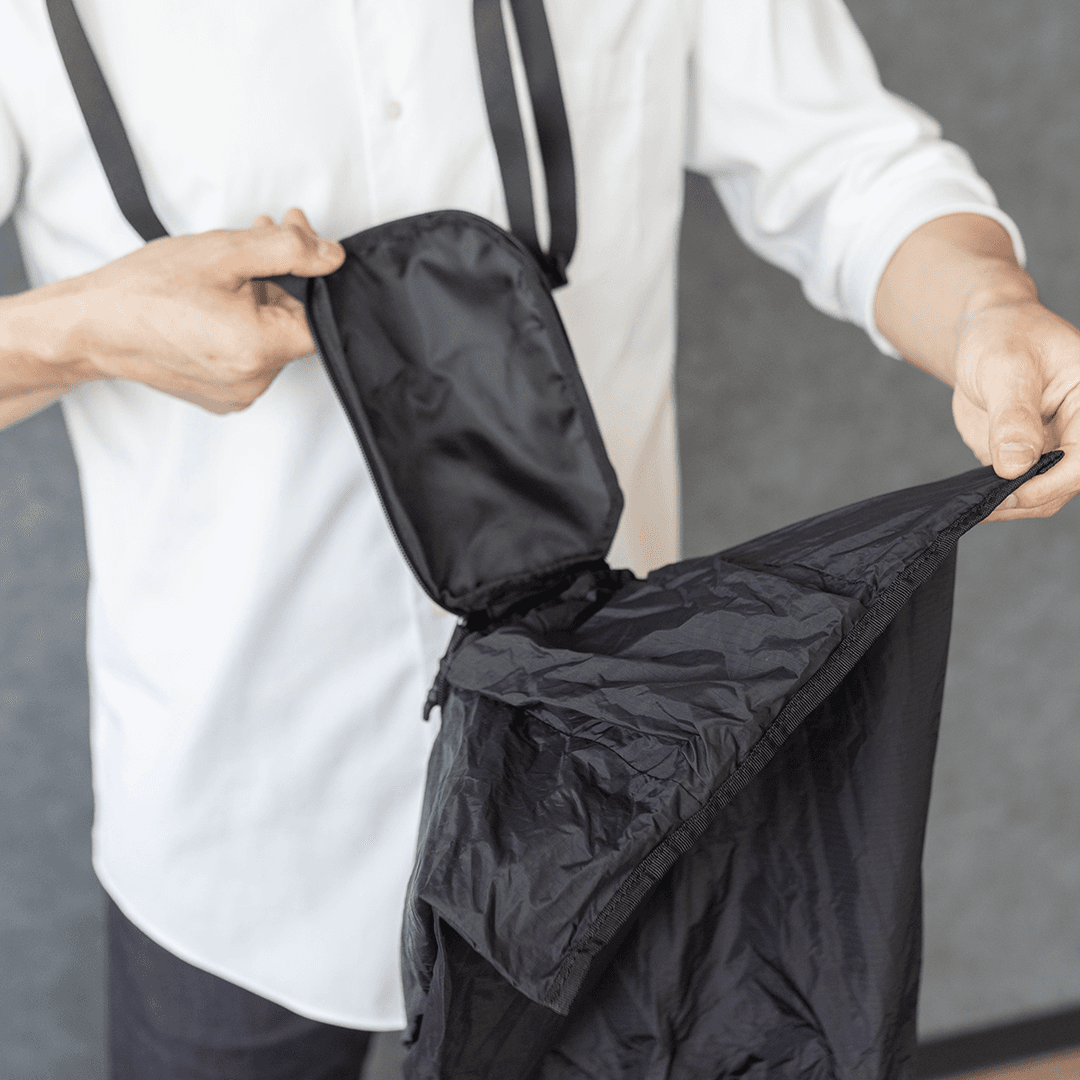 サコッシュの片面とストラップは邪魔にならないよう、ショルダーバッグの外側ポケットに収納してトランスフォーム完了です。