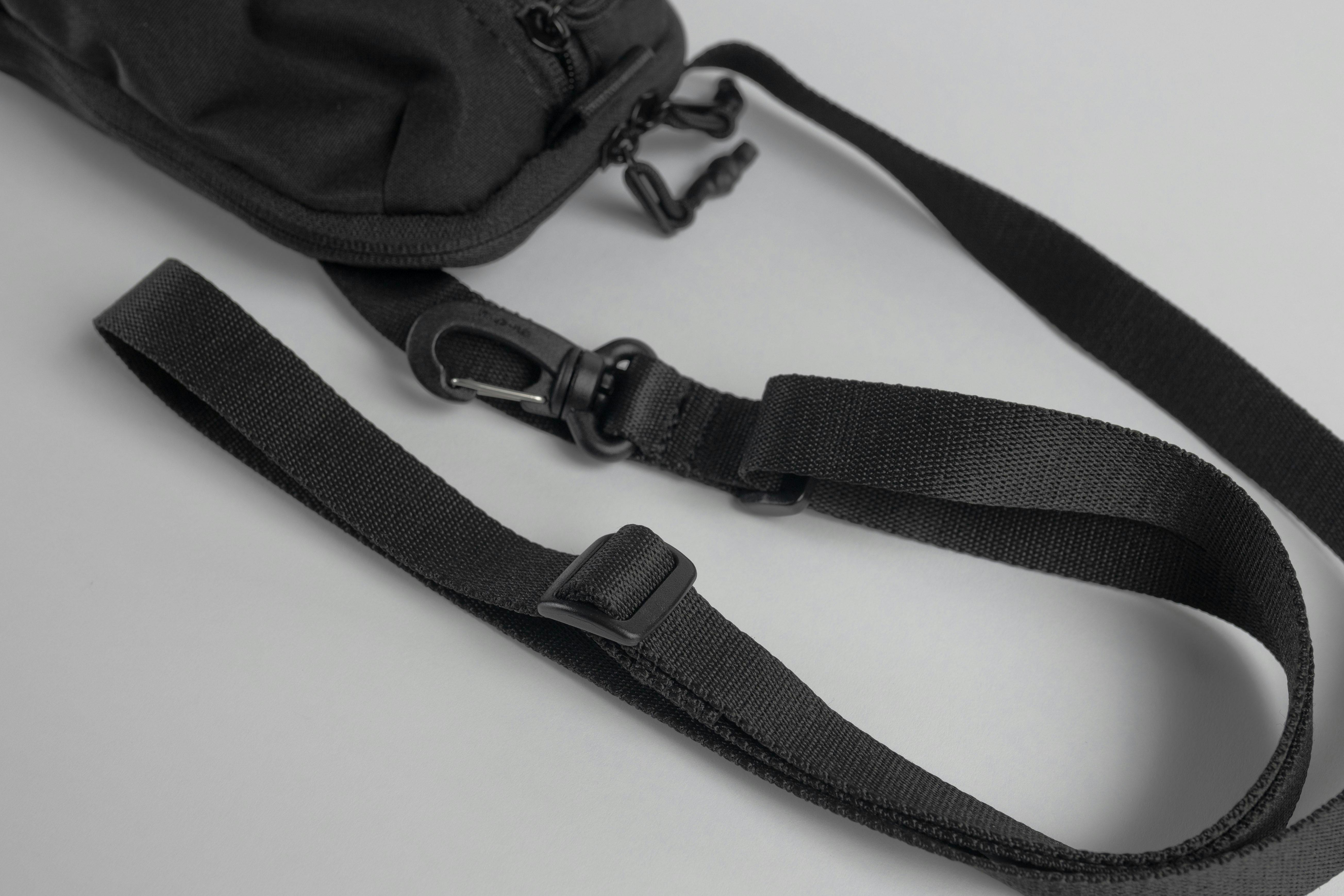 ショルダーベルトにはフック(ナスカン)を配しているため、鍵やイヤホンはこちらに引っ掛けてもOK。