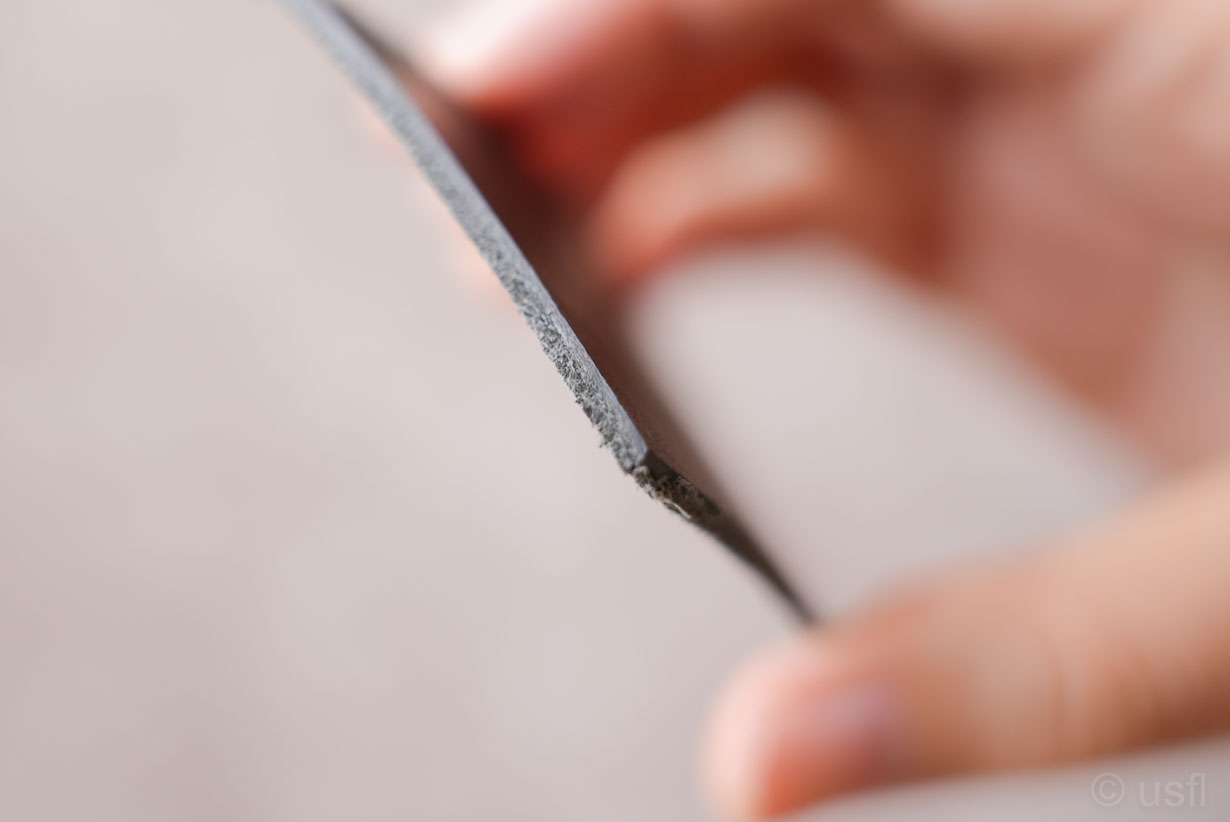 例えば、革を切った断面(コバ)は手触りが良くなく、毛羽立って見えるため高級感もいまいちです。