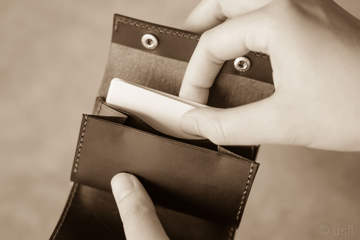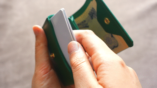 mini Sは、ただ差し込むだけ。一瞬です。財布を傾けたり、持ち方を替えたり、ポケットを触ったりの操作はありません。