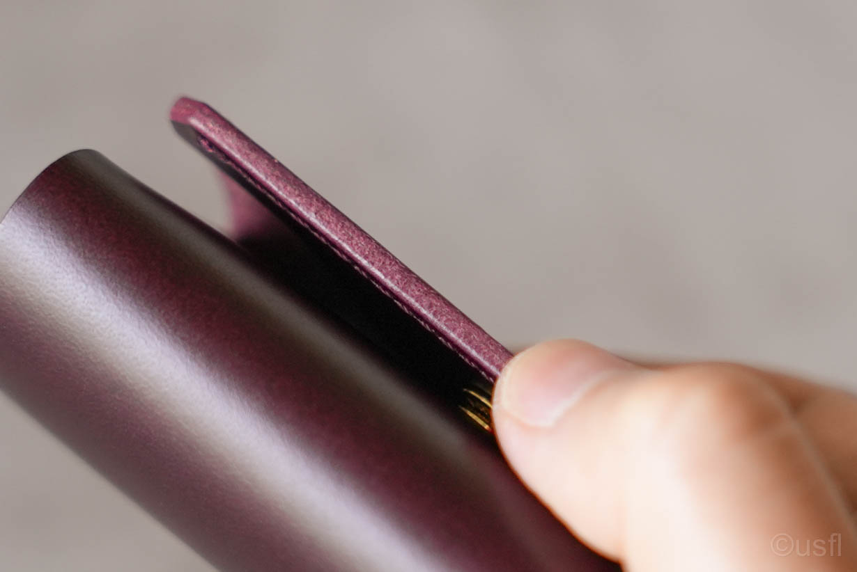 そこで、2枚のブッテーロを貼り合わせることで、固さ(ハリ)を作り込み、仕切りを動かしやすくしています。また、コバもなめらかに磨くことで、手触りも良く、心地よくお使いいただけるように仕上げました。