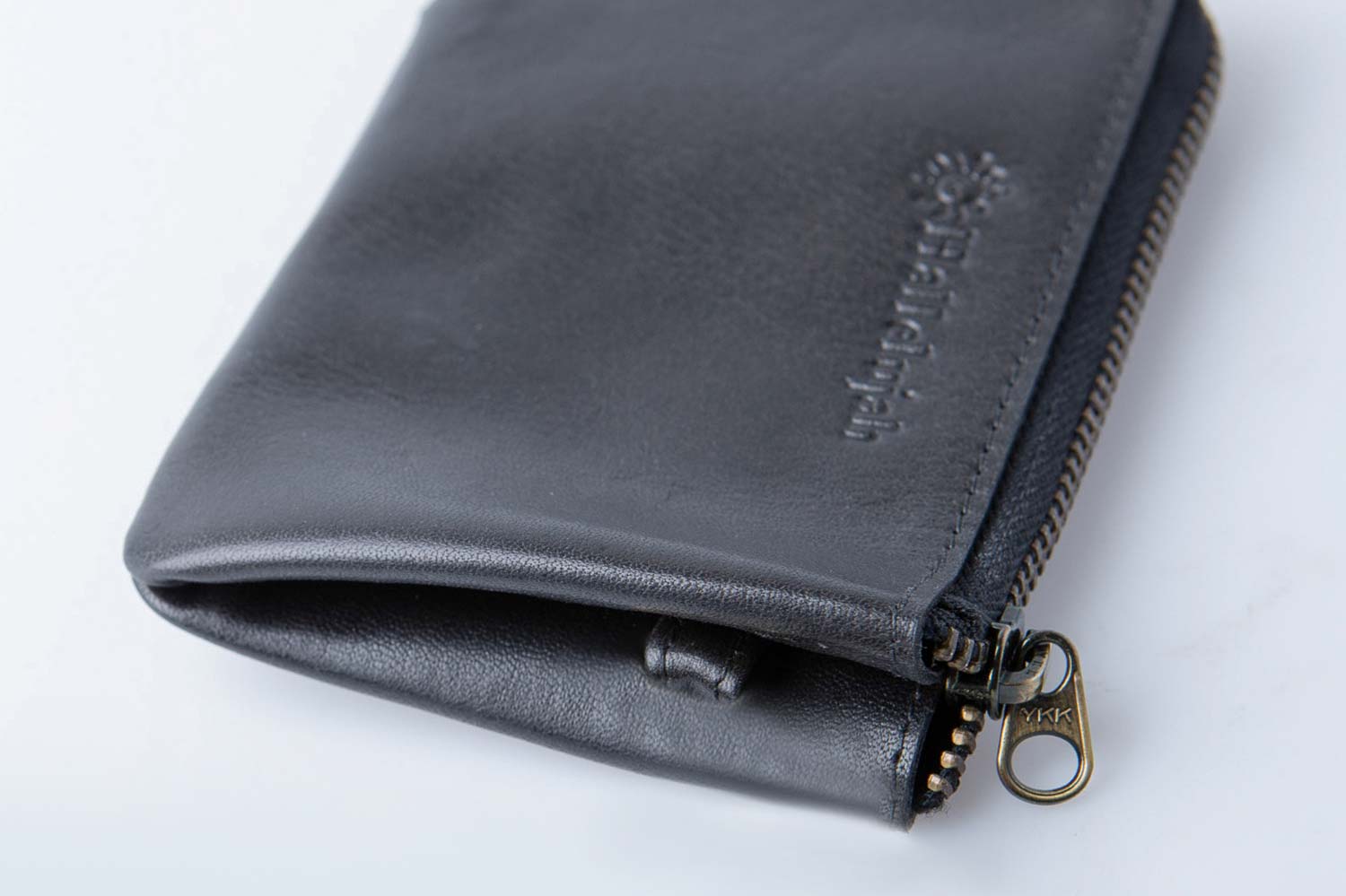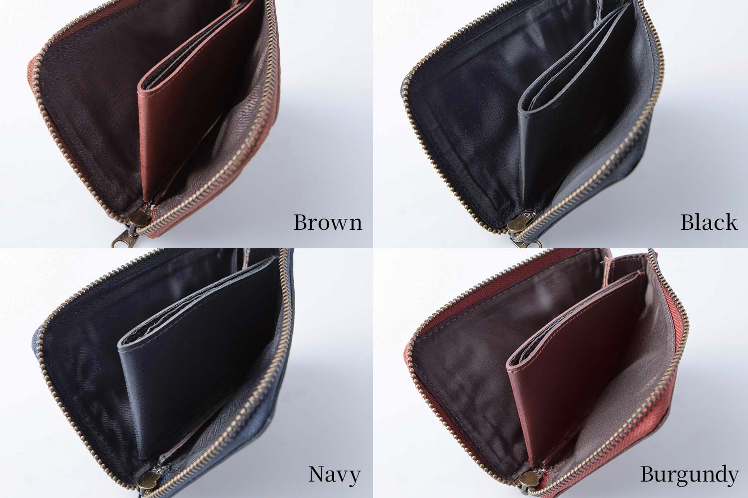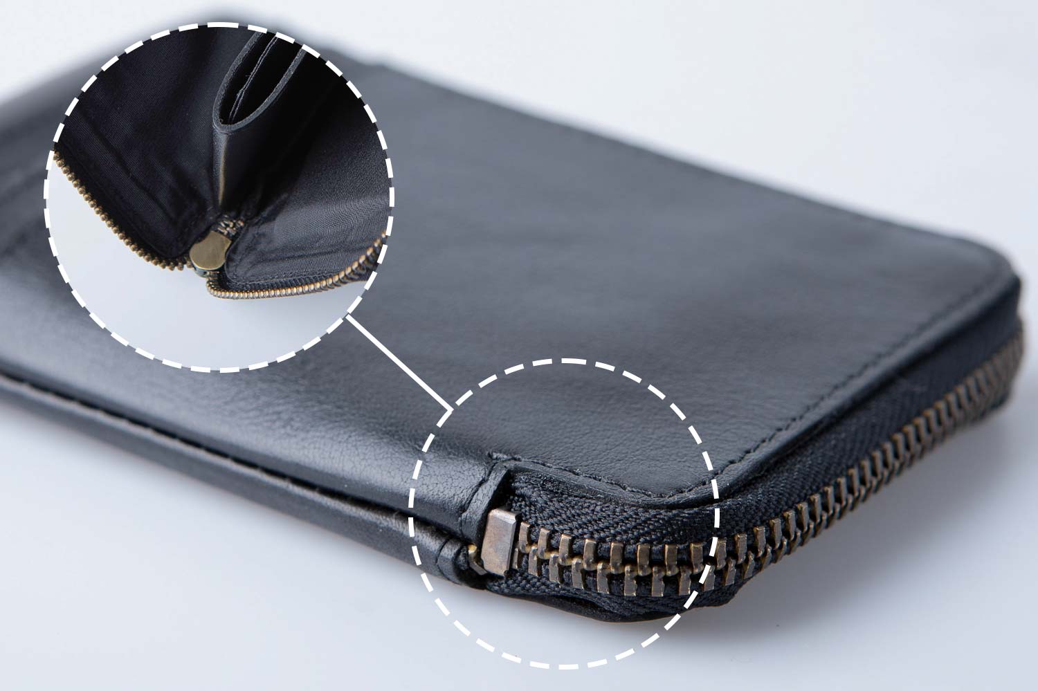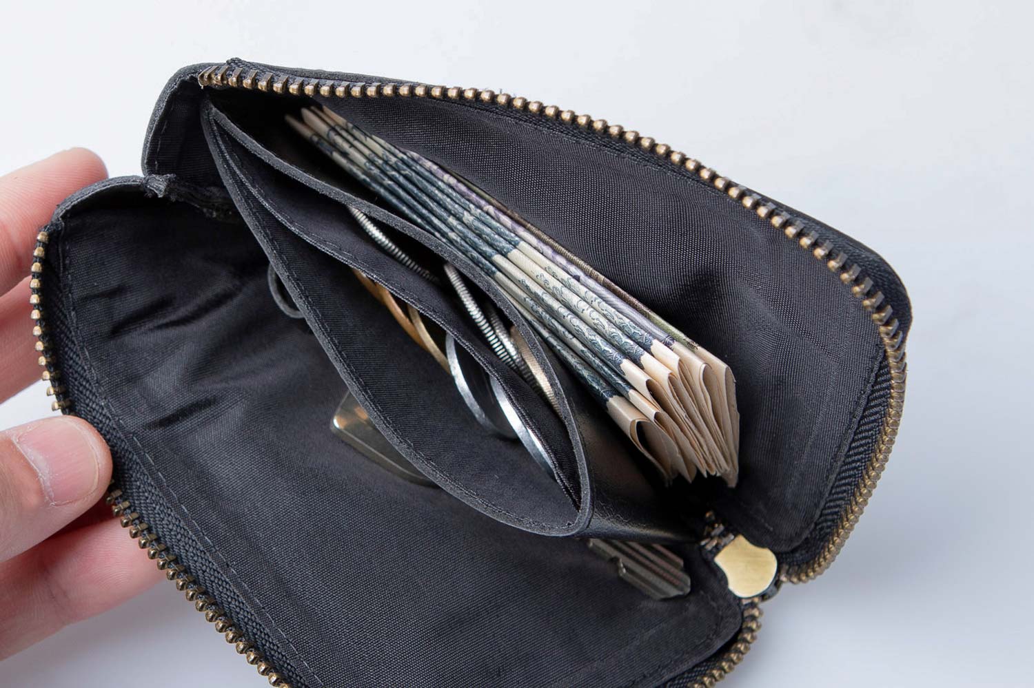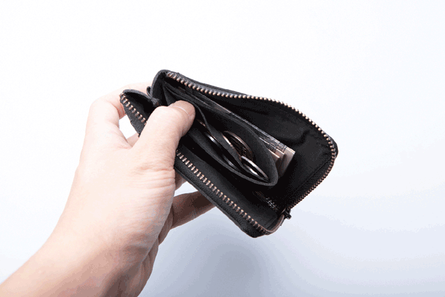 - ファスナー下に深めの切り込みを入れることで、全体のサイズはコンパクトながらも、窮屈さを感じることなく大きく開く設計に。中身の出し入れもスムーズで快適です。