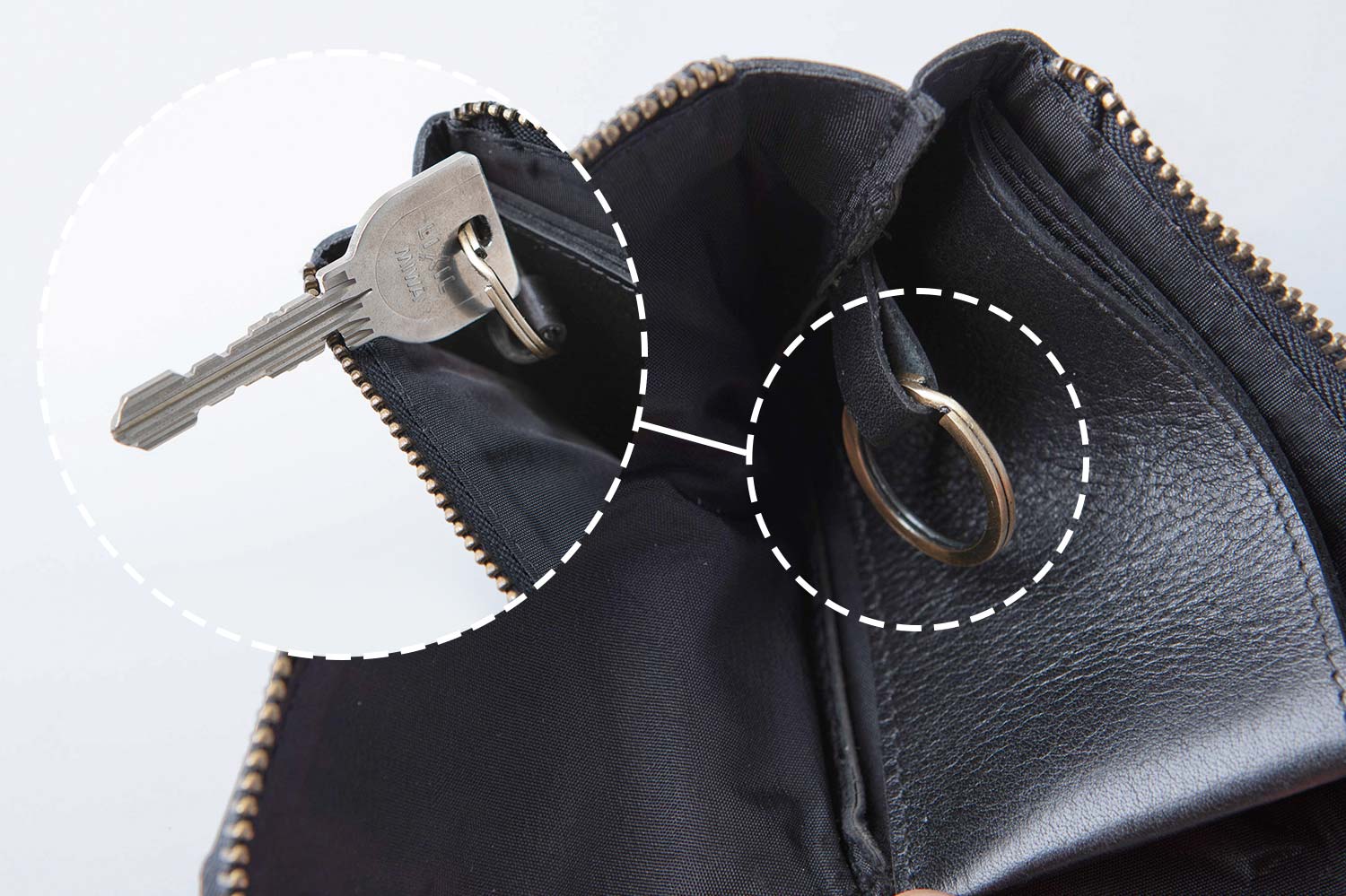 鍵もスマートに収納。内側にキーリングを装備