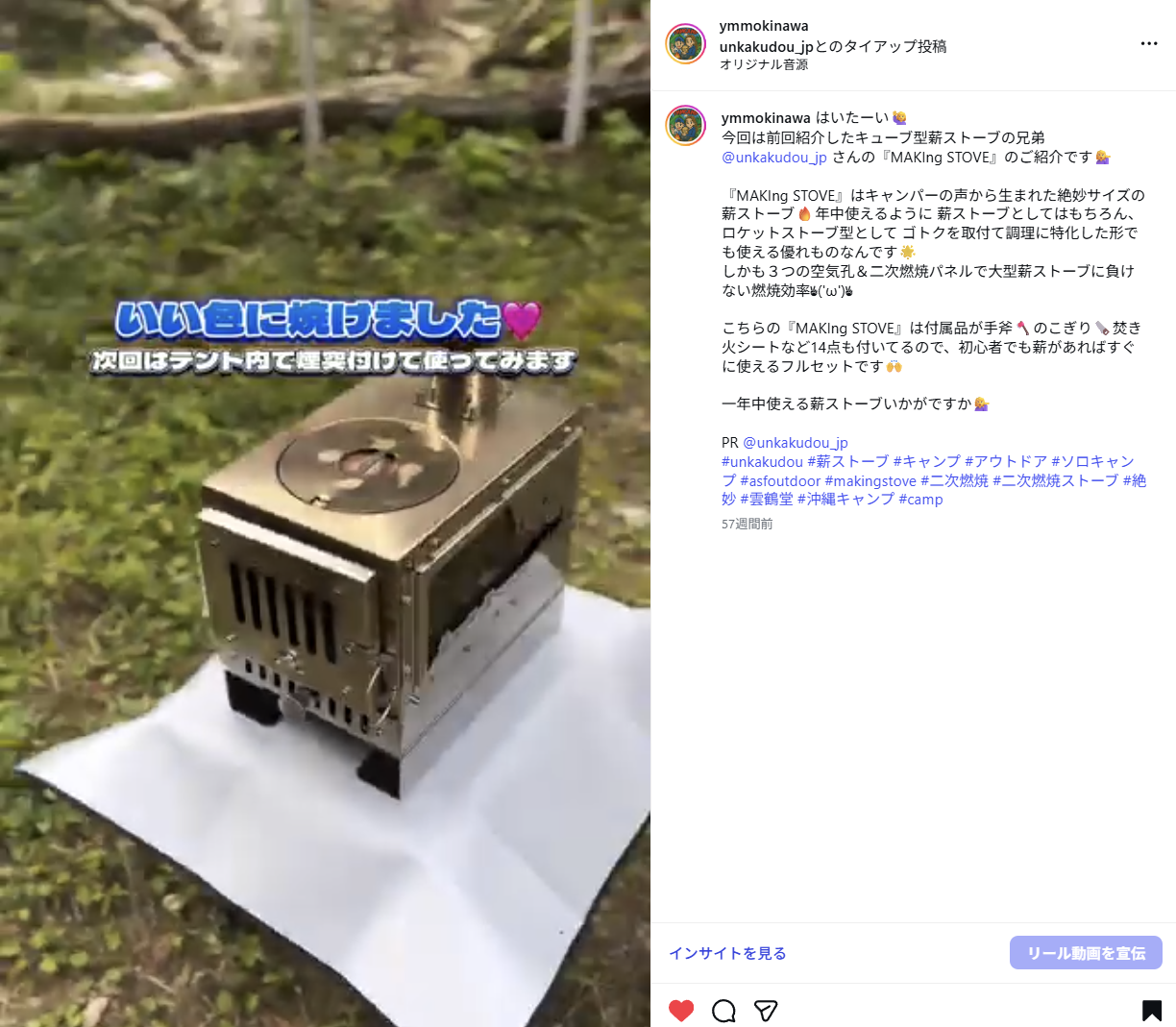 「ロケットストーブ型として ゴトクを取付て調理に特化した形でも使える優れものなんです🌟しかも3つの空気孔&二次燃焼パネルで大型薪ストーブに負けない燃焼効率✌︎('ω')✌︎」とのご感想を頂きました!