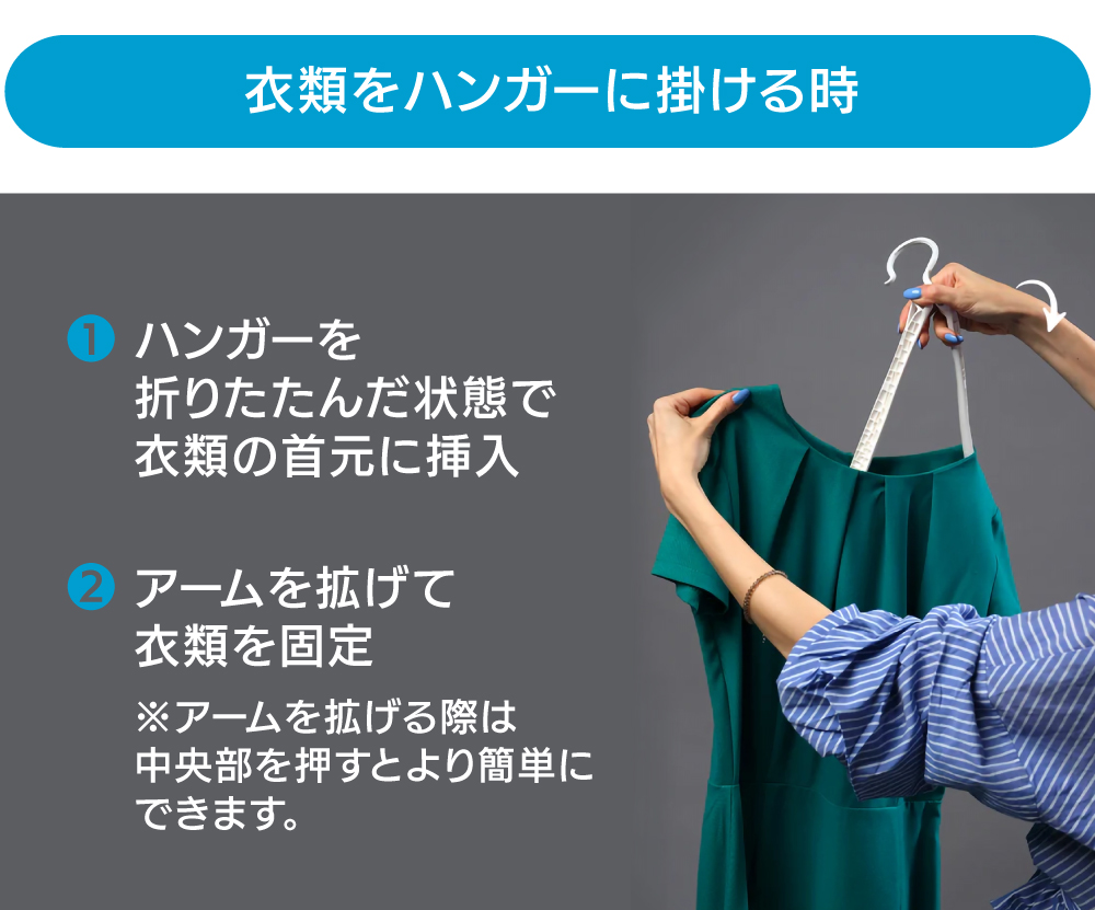 また、衣類を掛ける際には、ハンガーを折りたたんだ状態で衣類の首元に挿入し、アームを広げて固定します。