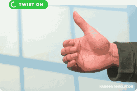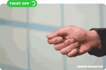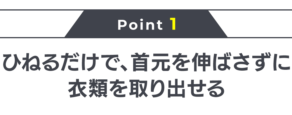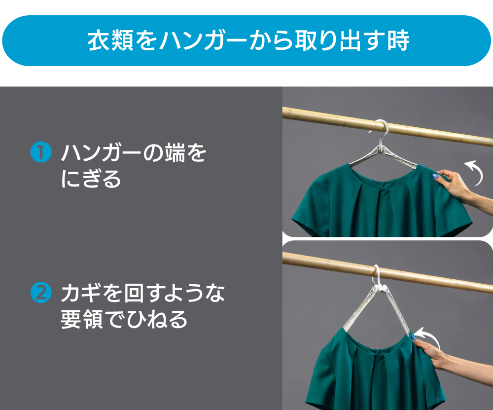 ハンガーの端をカギをまわるようにひねるだけで、首元を伸ばさずに衣類を取り出せます。