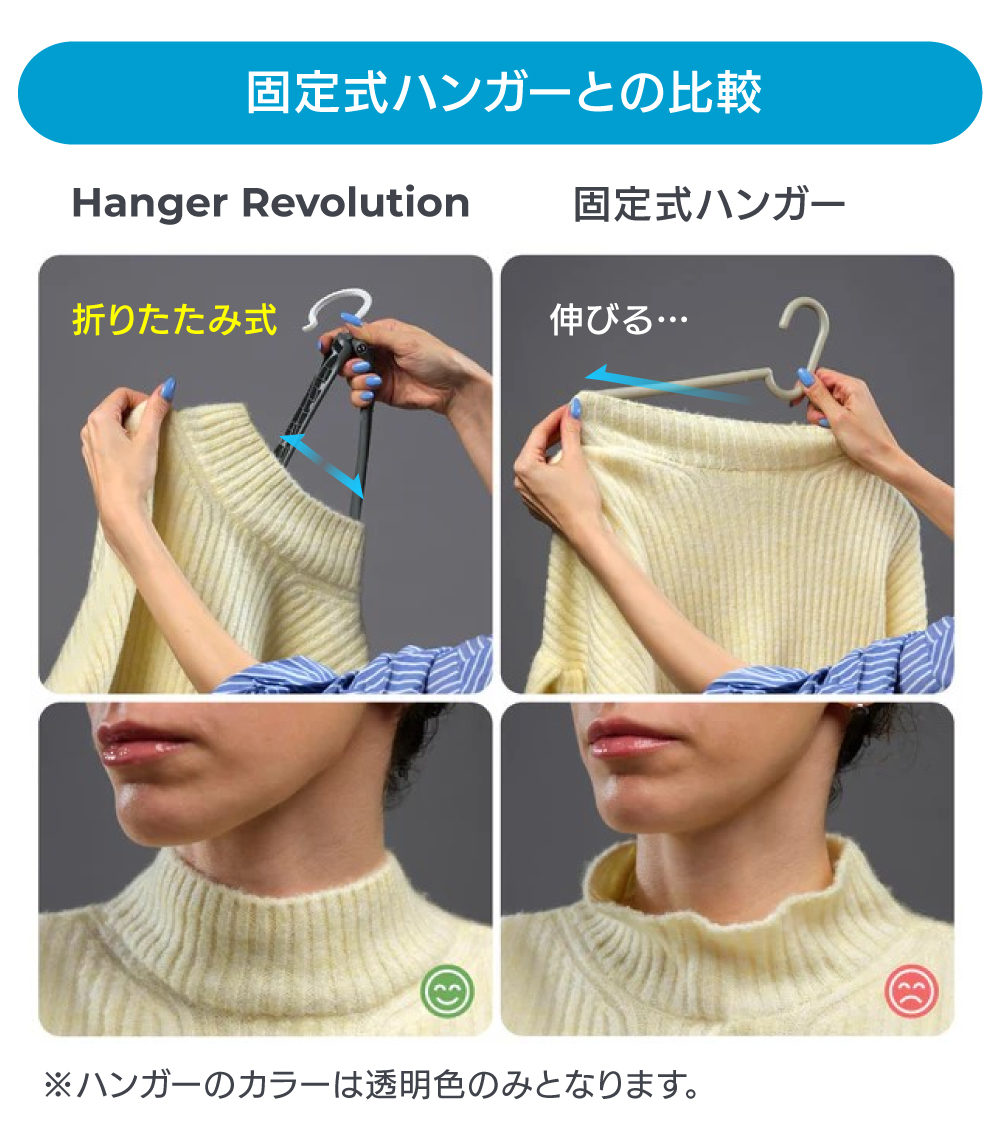 また、折りたたみ式ハンガー(Hanger Revolution)と通常のハンガーを一緒に使用する場合は、例えば、折りたたみ式ハンガーを左側、通常のハンガーを右側に配置するなど、明確に分けて配置してください。