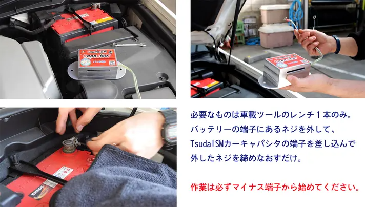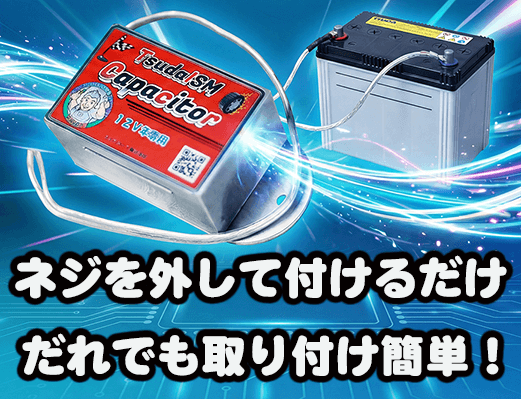 TsudaISMカーキャパシタは、車のバッテリーの端子のネジに取り付けるだけです。誰にでも簡単にできます。
