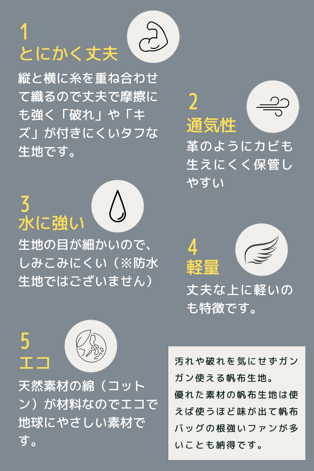 バッグに使用している帆布(はんぷ)生地 (英名:キャンバス)