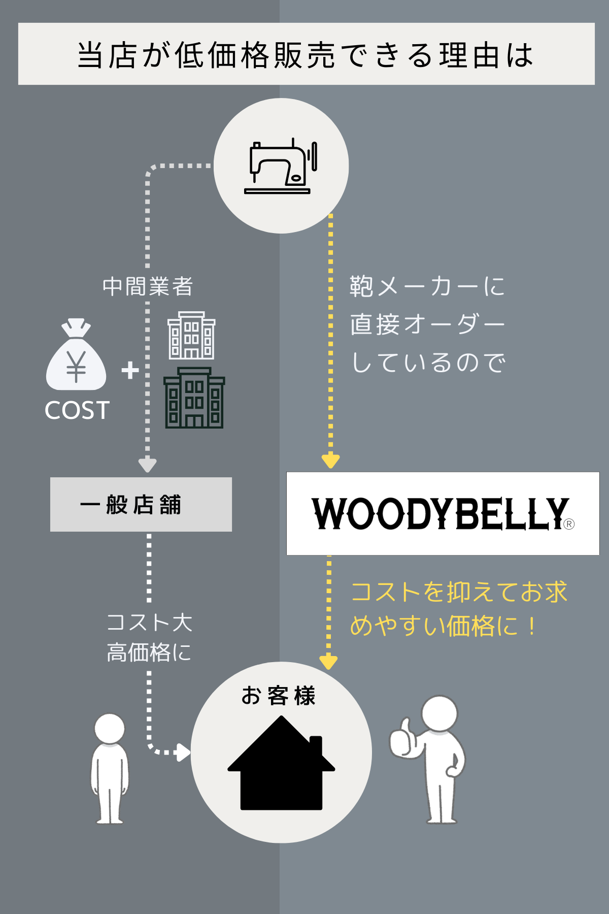 信頼できる製造工場を独自に開拓、直接交渉しています。そのため、単に卸業者から仕入れて販売している商品に比べコストを大幅に抑えることが実現できました。