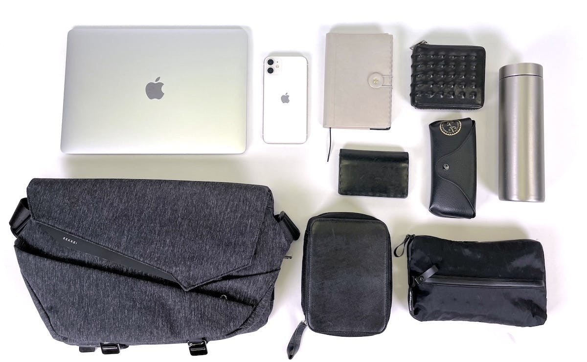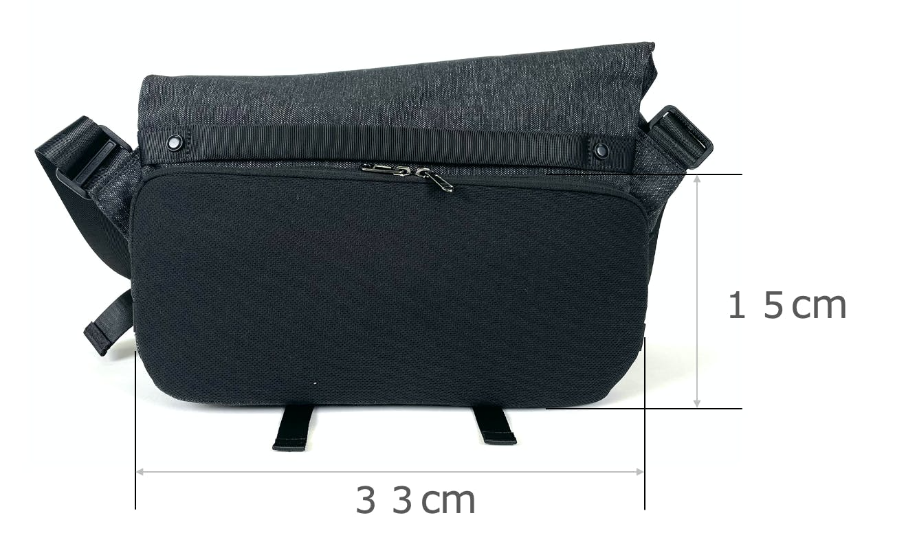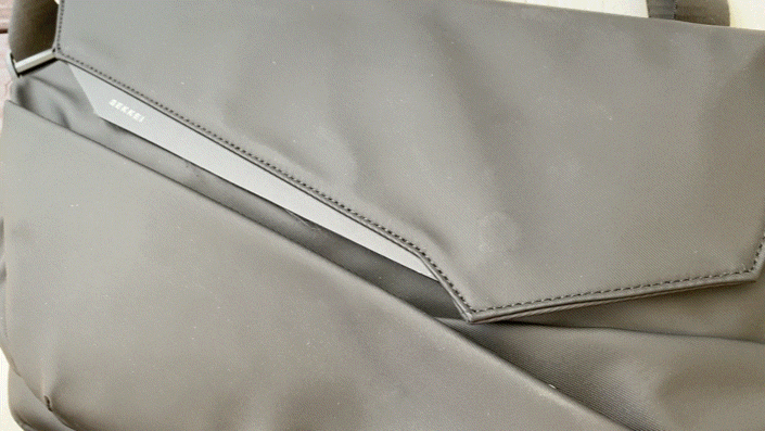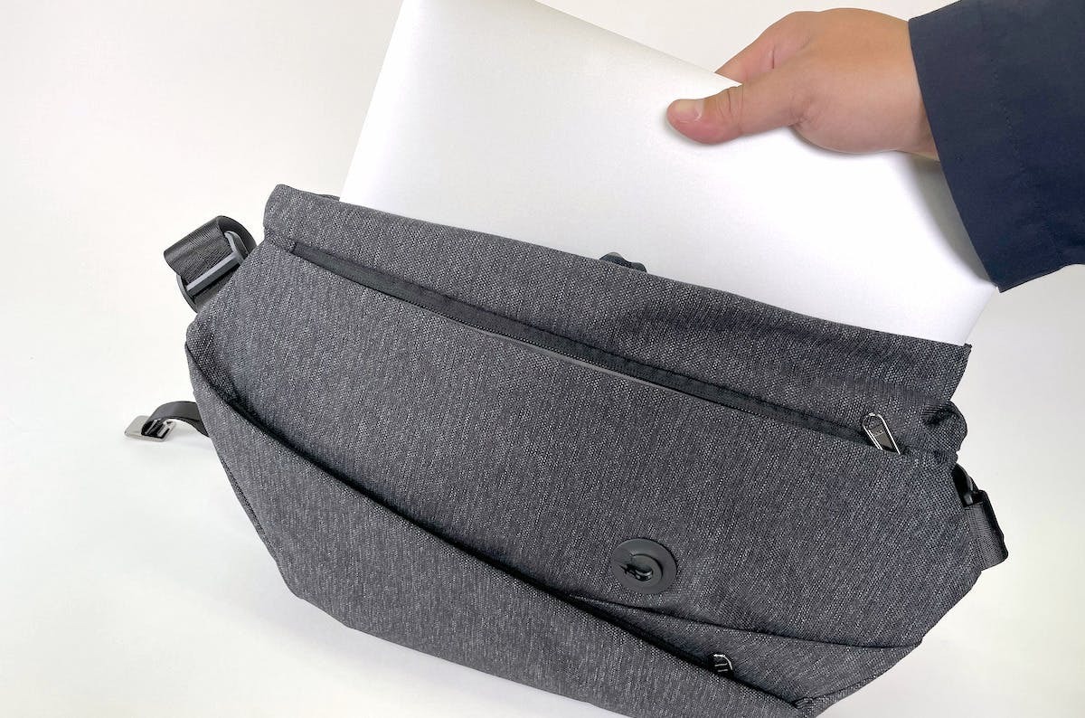 A:今作のSEKKEI MX-slingには14インチよりも大きいノートパソコンは収納できません。13.6インチまでの MacBook Airはすべてのモデルが収納可能です。特にご注意いただきたい点は、LAPTOPコンパートメントに縦の長さが23cm以上の端末を収納するとマグネットボタンを留められず、フラップが閉まりません。ご注意ください。14インチ以下のLAPTOP、MacBook Air やiPadなどのタブレットを持ち運ぶことを想定して設計しています。