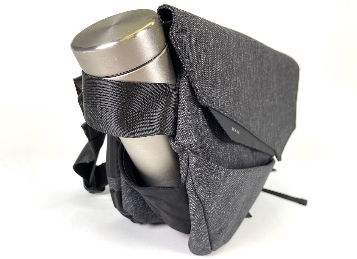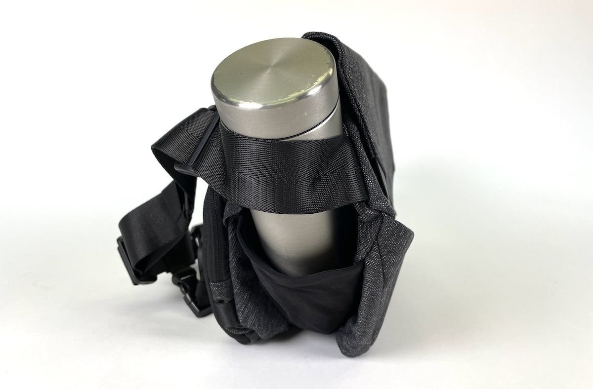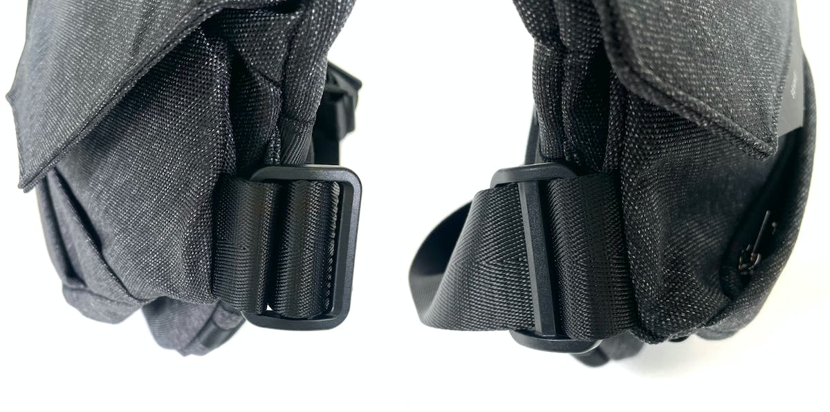 SEKKEI MX-sling はバッグ本体側のプラスチックバックルの向きが左右で違う仕様になっています。片側のボトルポケットの上部にはUSB 差込口があり、バックルがボトルに干渉してしまうのと、バックルが体にあたることを考慮しました。