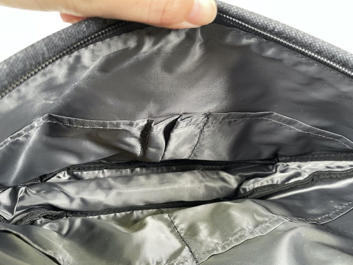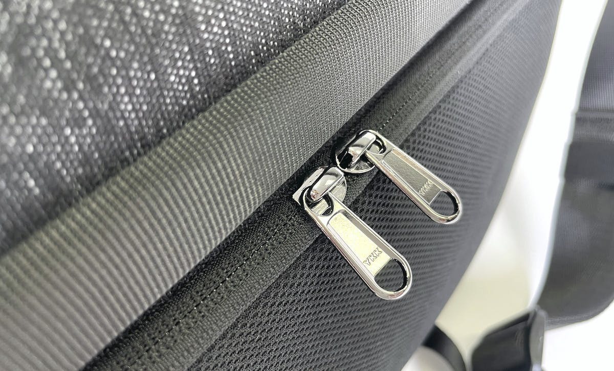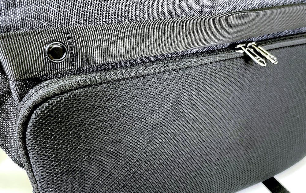 バッグ背面のセキュリティコンパートメントは伸縮性のあるメッシュ素材でファスナー付き。