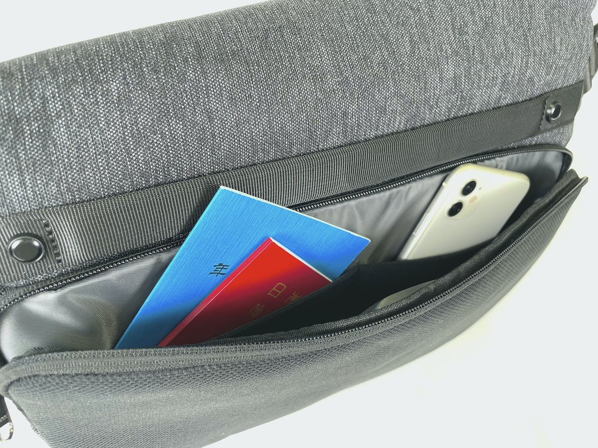 小物用のポケットが4つに、ペン用のスリットも2つ。予備バッテリーや文具類なども仕分けして収納できます。2.0cm ⇔ 9.5cm に拡張、収縮の可能なメインの収納領域です。