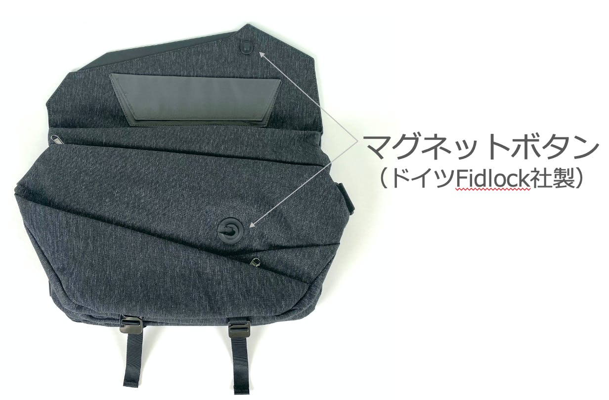 フラップの開閉にはドイツ Fidlock社のボタンマグネットを採用しました。理由は二つ。