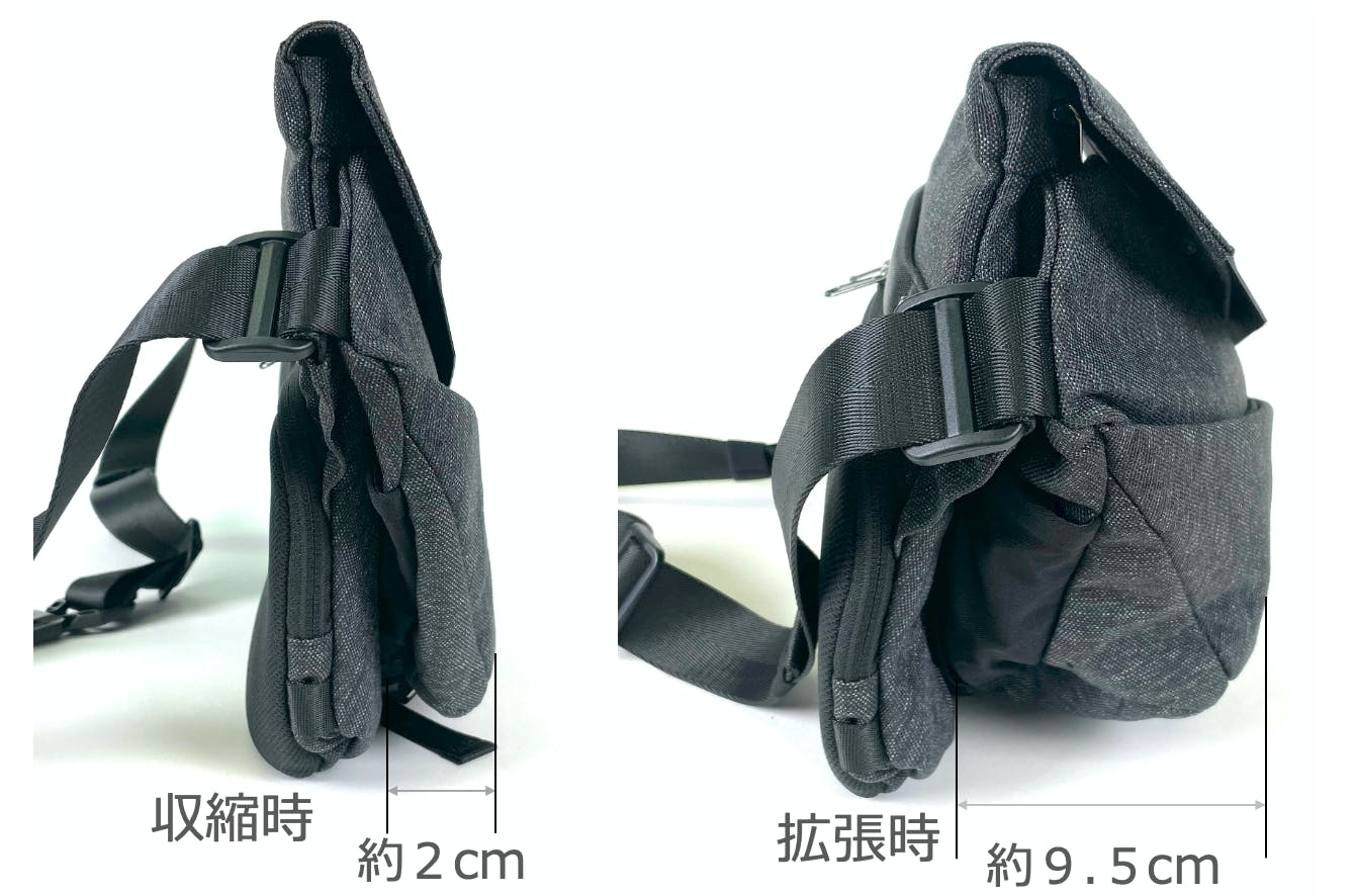 メインコンパートメントを最大まで拡げて、パンパンにアイテムを詰め込んだ場合の使用イメージです。拡張時の最大容量は 9 L になります。街ブラなどで使うだけなら、マチを拡げなくても十分な容量です。