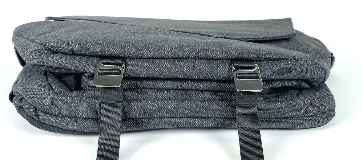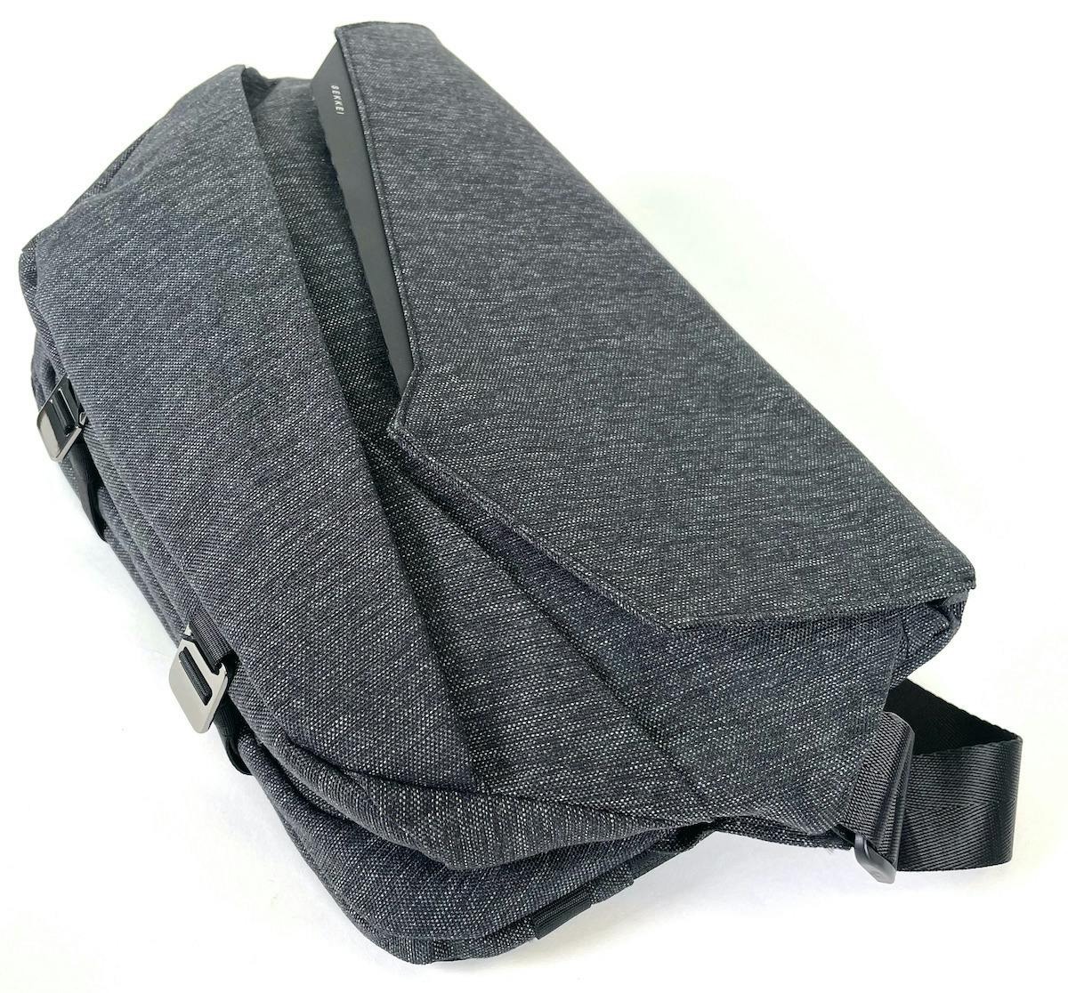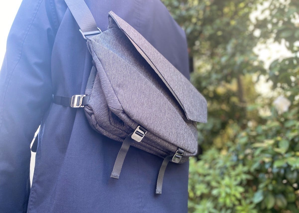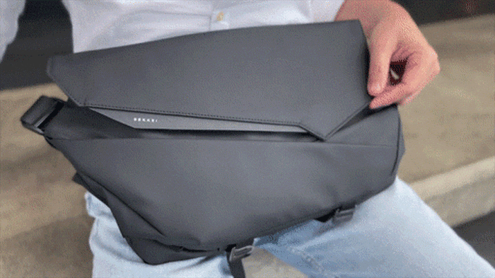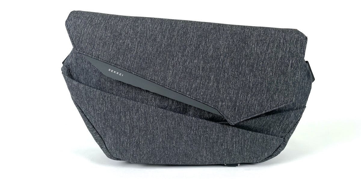 「SEKKEI MX-sling」をアイコニックに見せているのは、この直線的でエッジの効いたフォールドトップ。