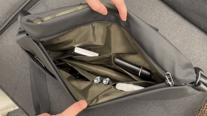 A:容量は拡張時で約9Lです。一眼レフカメラや700mlペットボトルも収納可能です。