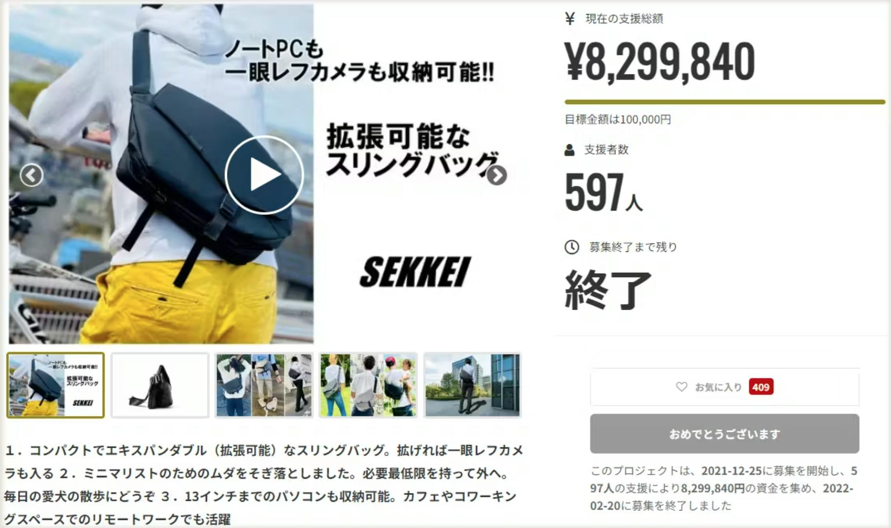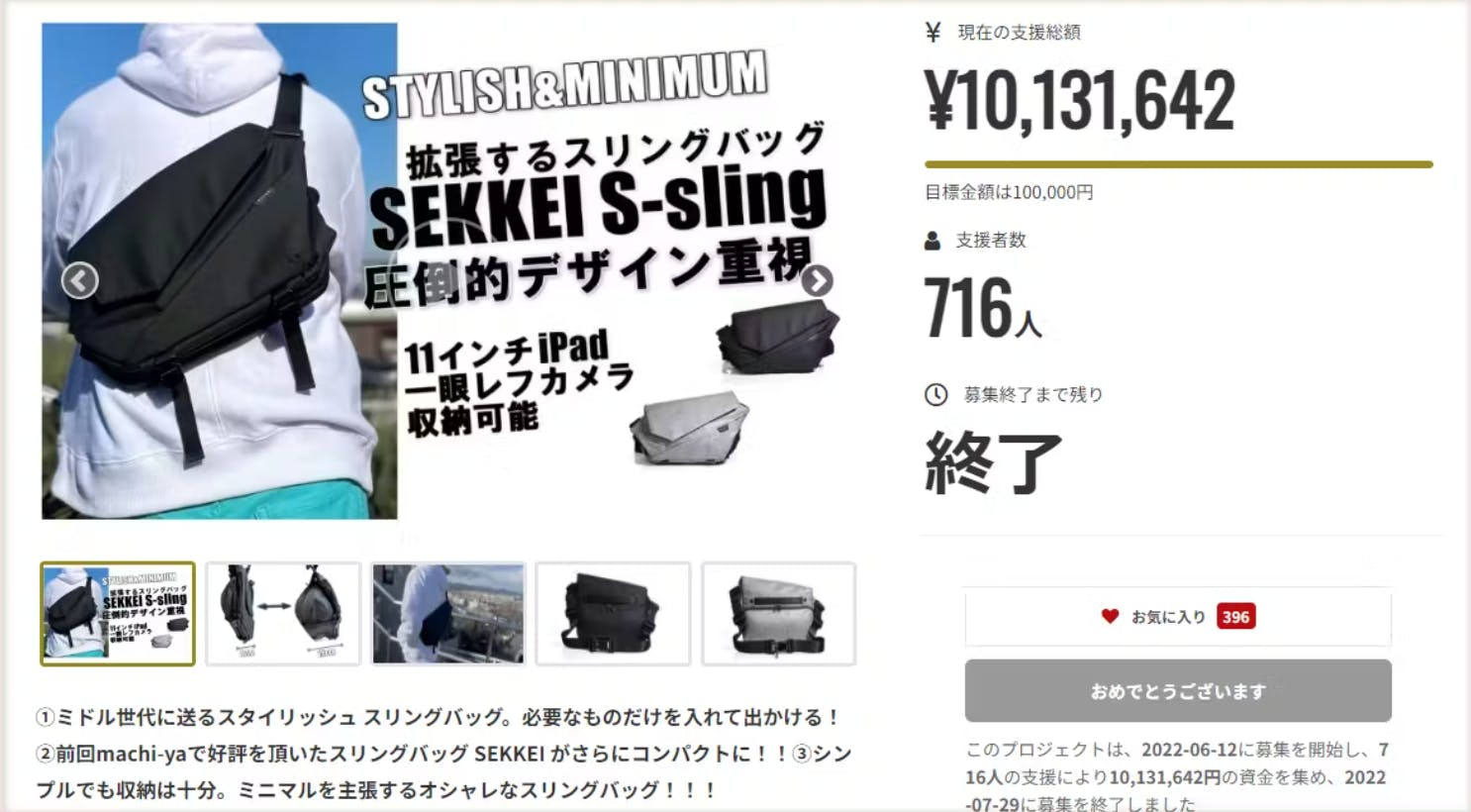 そして「SEKKEI M-sling 」の販売から1年。寄せられたご意見やご要望を反映して、よりスタイリッシュに「背負ったミドル世代の背中が10歳若く見える」をコンセプトに「SEKKEI S-sling」を発表。クラウドファンディングで大成功を納めることができました!